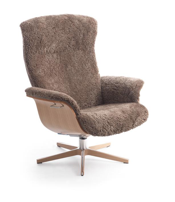 Upholstery Sheepskin, leather or fabric. Legs/base Swivel in chrome metal, black metal or wood/aluminum. 4-legs chair in oak (oiled or black stain). Flex chair in oak (oiled or black stain).