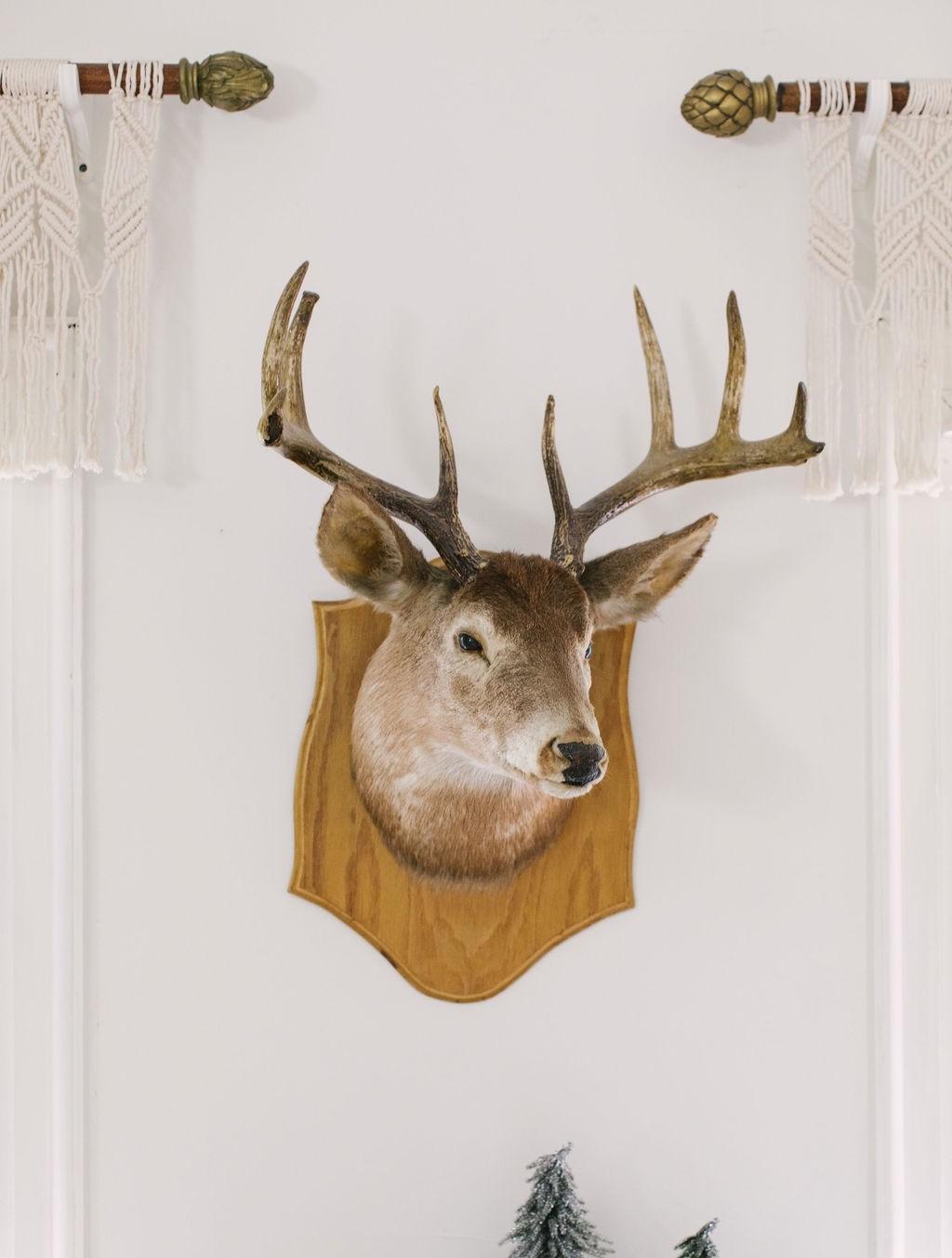 Keeping in the theme of neutrals throughout the cottage, I chose a large acrylic painting from my artist-husband Robert Moore. I fell in love with this deer photograph I saw on Instagram @BeckiandChris by Becki Peckham, ordered it and popped it in one of our Matinee Frames with some privet berries from Galbraith Florists. I then added fresh greenery to the picture frame.