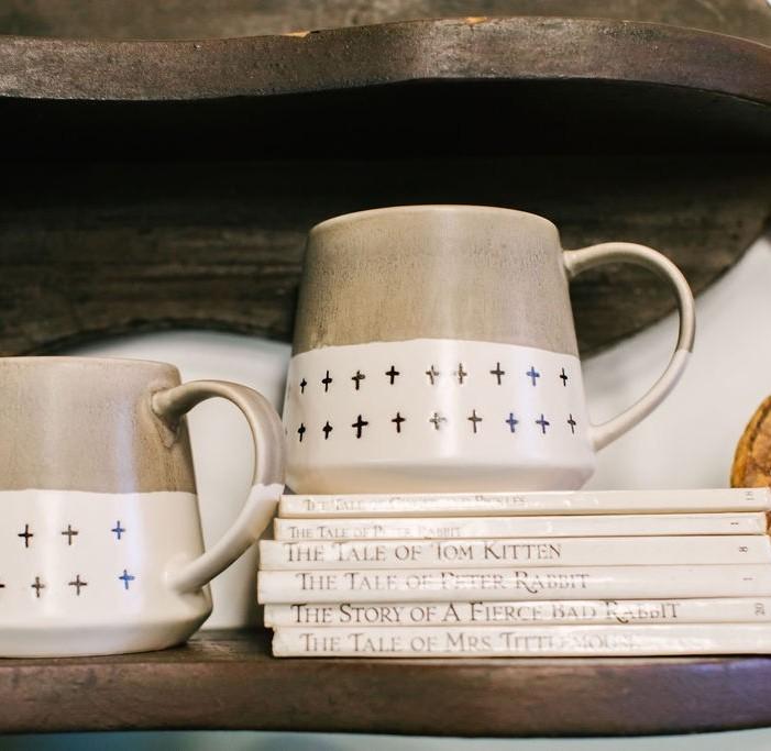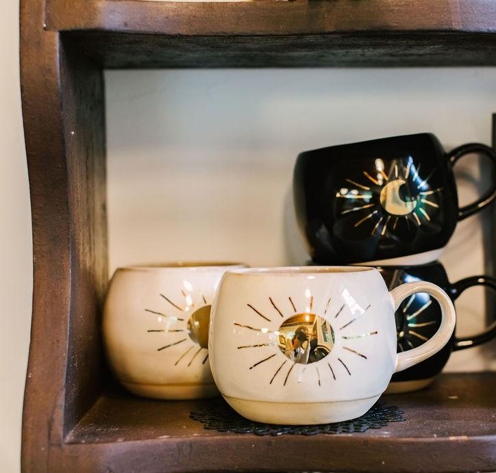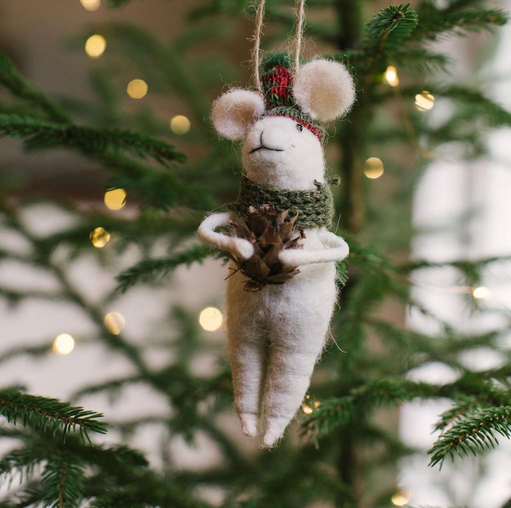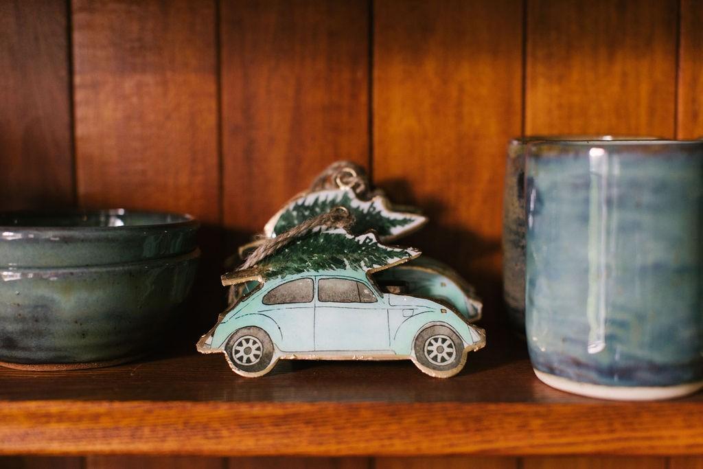 Festive Fir Trees (S, M, L); A White Nest Pottery Mugs, tumblers and pinch bowls (vary); Tree-Topped Punch Puggy Ornament; Tree-Topped Peace Van Ornament; Golden Bird Ornament/ Midnight Shimmer Ornament Green; Midnight Shimmer Ornament Olive; Midnight Shimmer Ornament Turquoise; Tinseltown House Ornament (L); Iron Heart Lace Ornament; Following Page: Camper Mints; A White Nest Mugs; Midnight Shimmer ornament, Olive & Green; Golden Bird ornament L