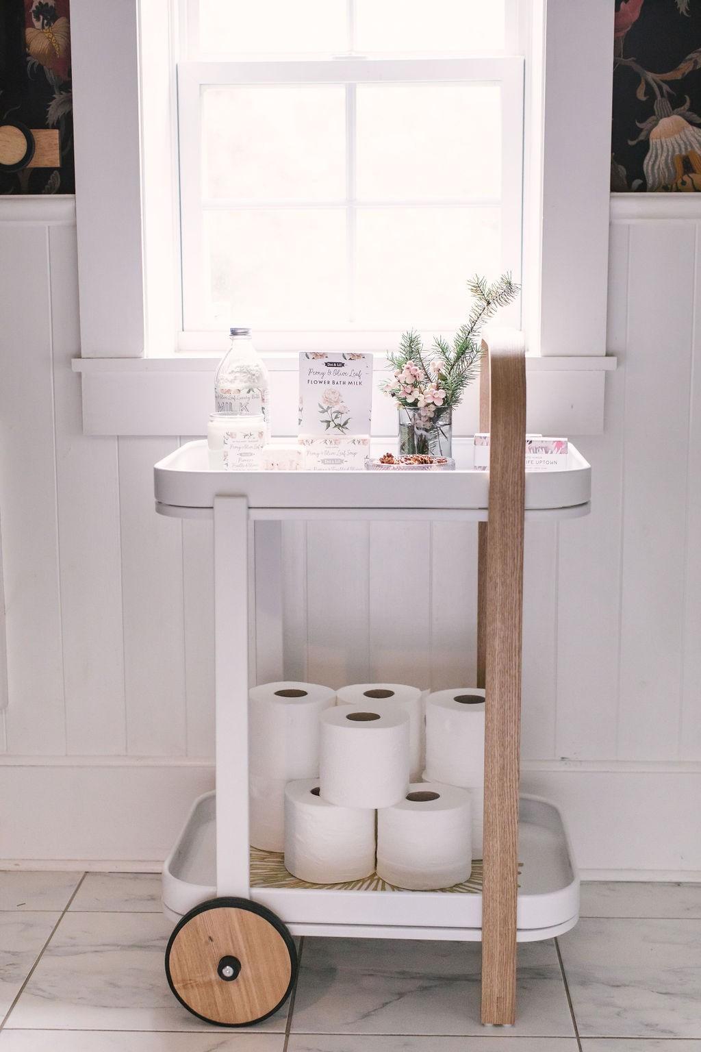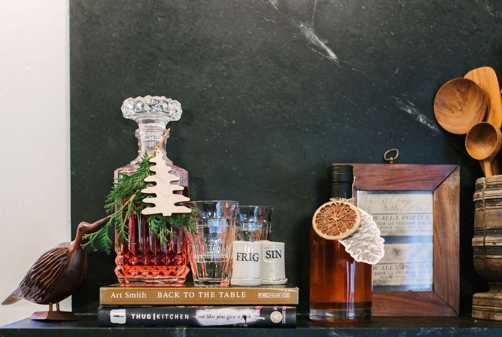 Bar carts are processional. That is, it’s as much as an event as it is a thing, something that happens prior to the meal, after the meal, or during. My advice is to stock it full of local spirits whenever possible, and enliven it with touches of gold hardware, sparkly glass and a sprig of greenery like rosemary or fresh pine.