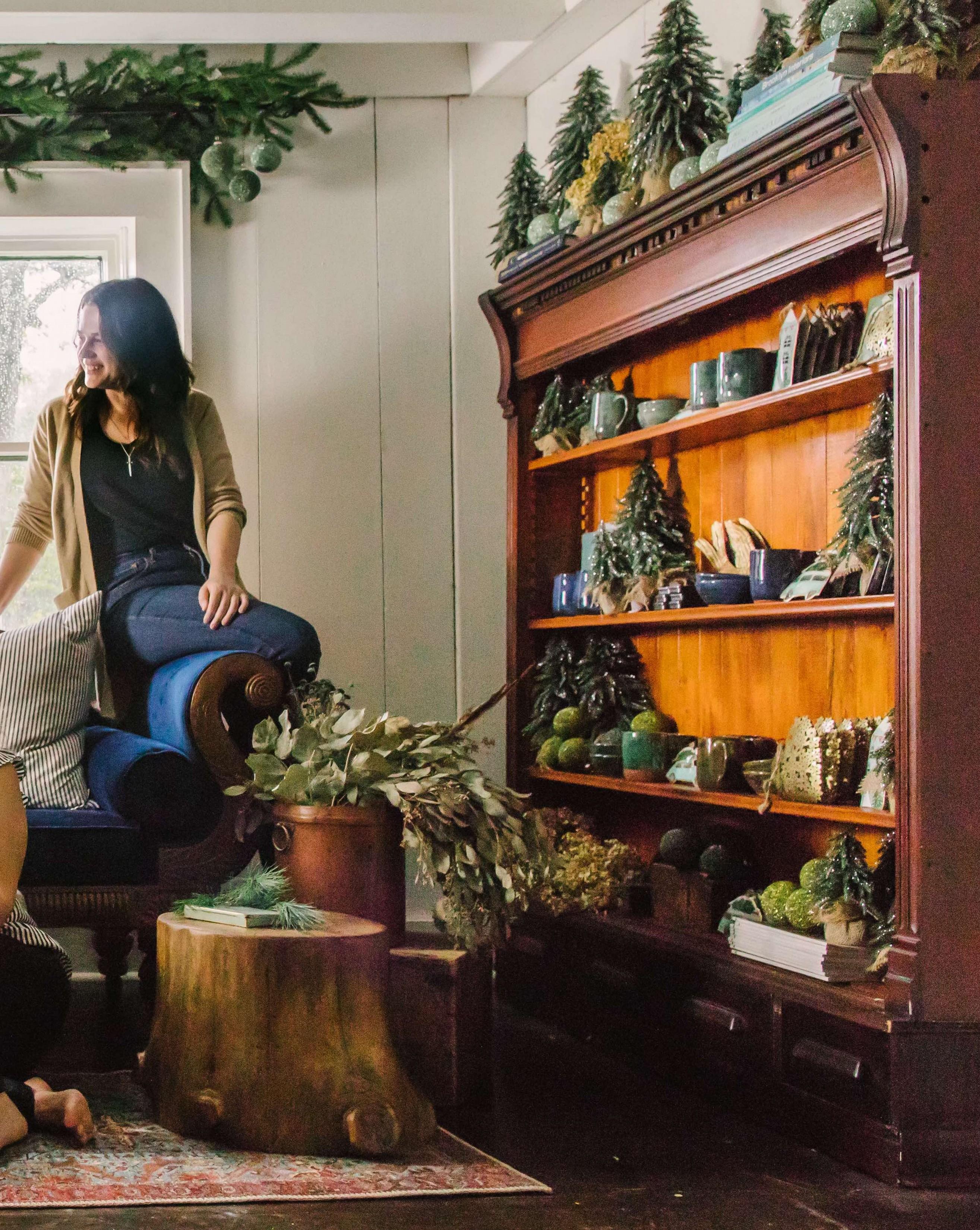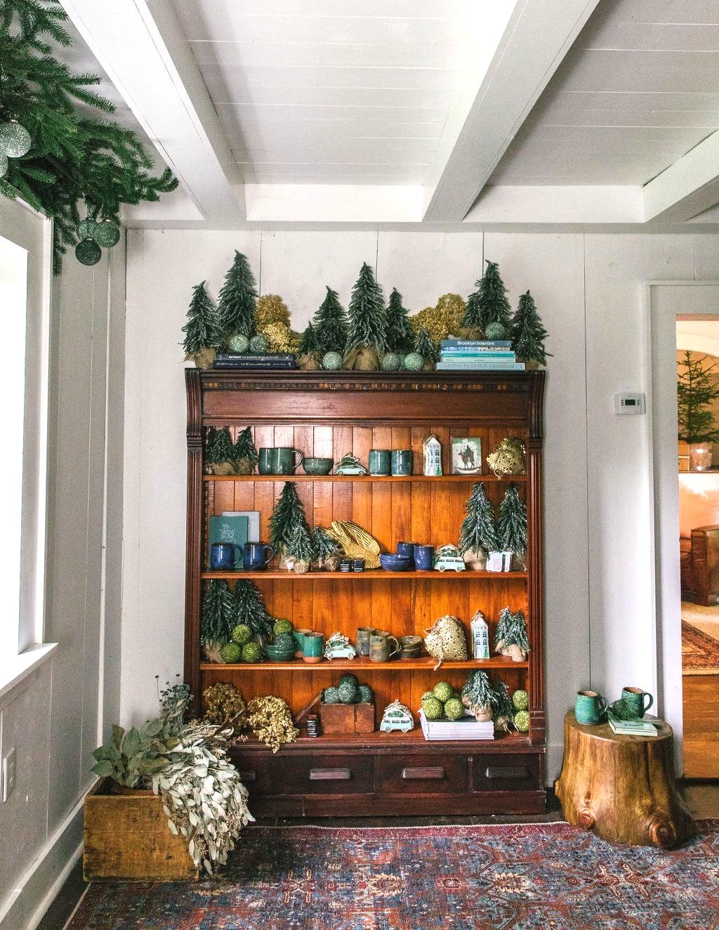 I love this historic gem I got from Mario at Citadel Gallery. He tells me that it originally came from a pharmacy in the Miramichi. It’s usually is chock full of my New Brunswick pottery collection and has glass doors on it but I thought for this Lookbook I’d create a little ‘Tuck Shop,’ filling its shelves with holiday décor.