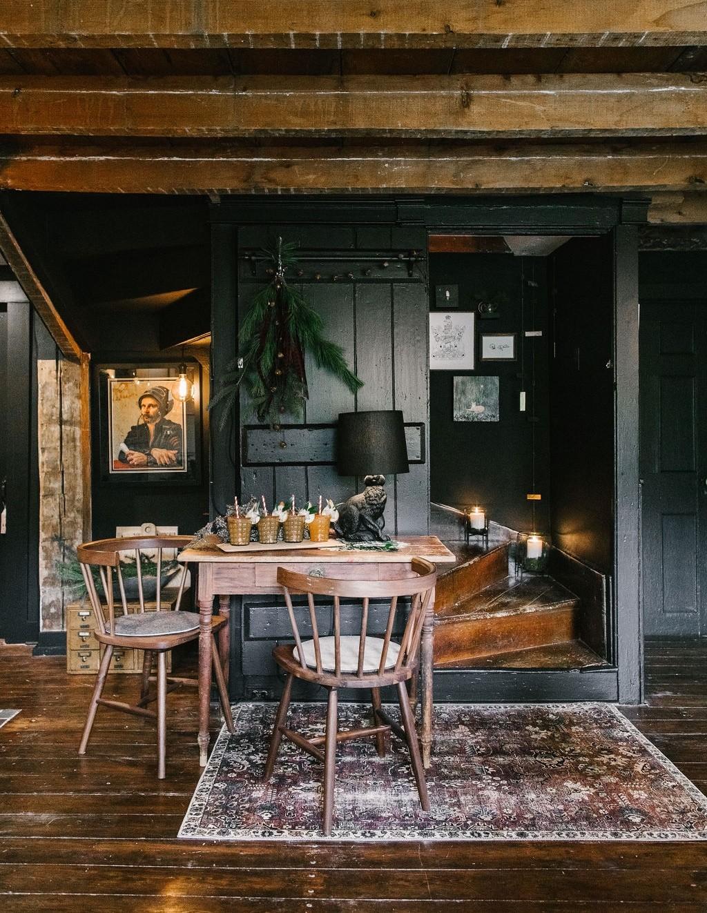 The kitchen’s design is anchored by Oxford White & Twilight Zone black walls, black cabinetry and soapstone countertops, all with a view to complement the rustic wooden floors and ceiling. The décor details feature wood, blacks, golds and local treasures!