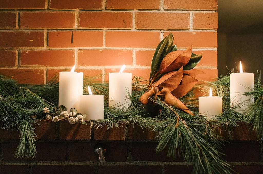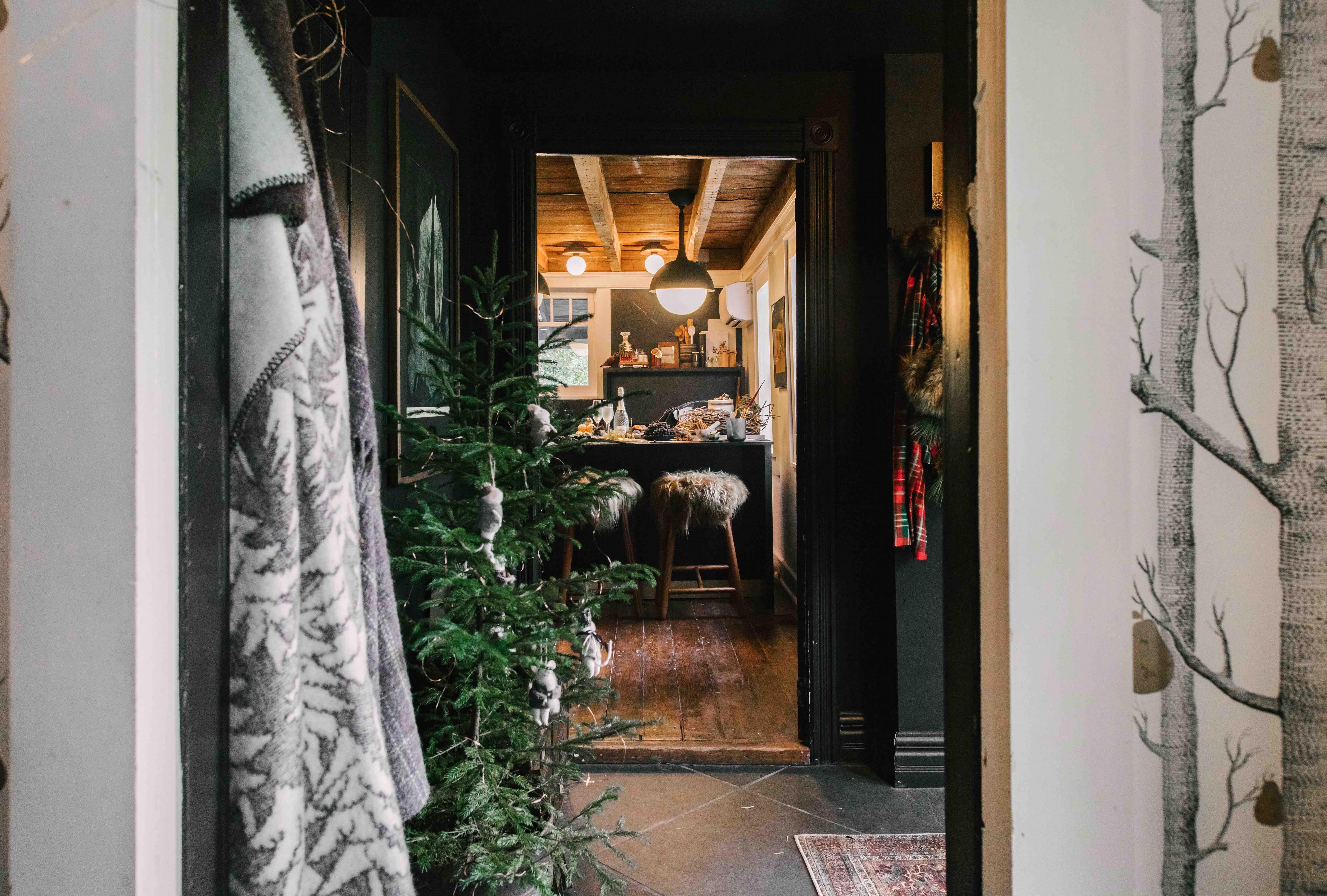 A few wooden stars, a potted fir tree in a wooden trash bin and a lit holiday candle is enough to do the trick. The bold, dramatic wallpaper also helps.