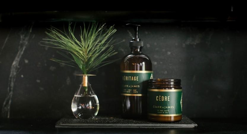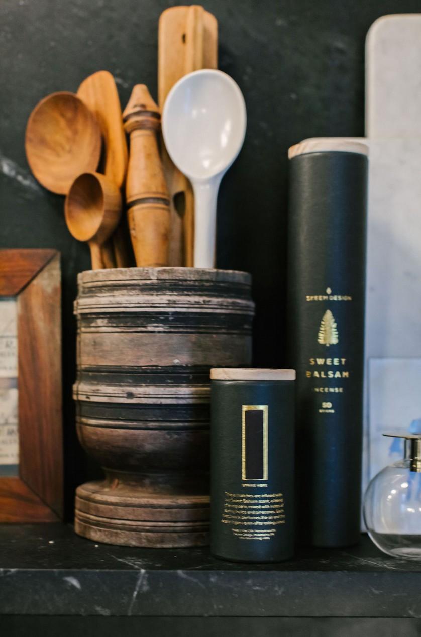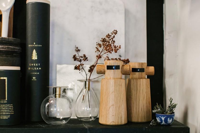 LEFT: Sweet Balsam Incense; Sweet Balsam Scented Matches; Richelieu hardware; Jules Runner; Heritage hand soap, Cedar Candle; Pog Spicer Grinder; Coast Serving Boards (Long and Medium)