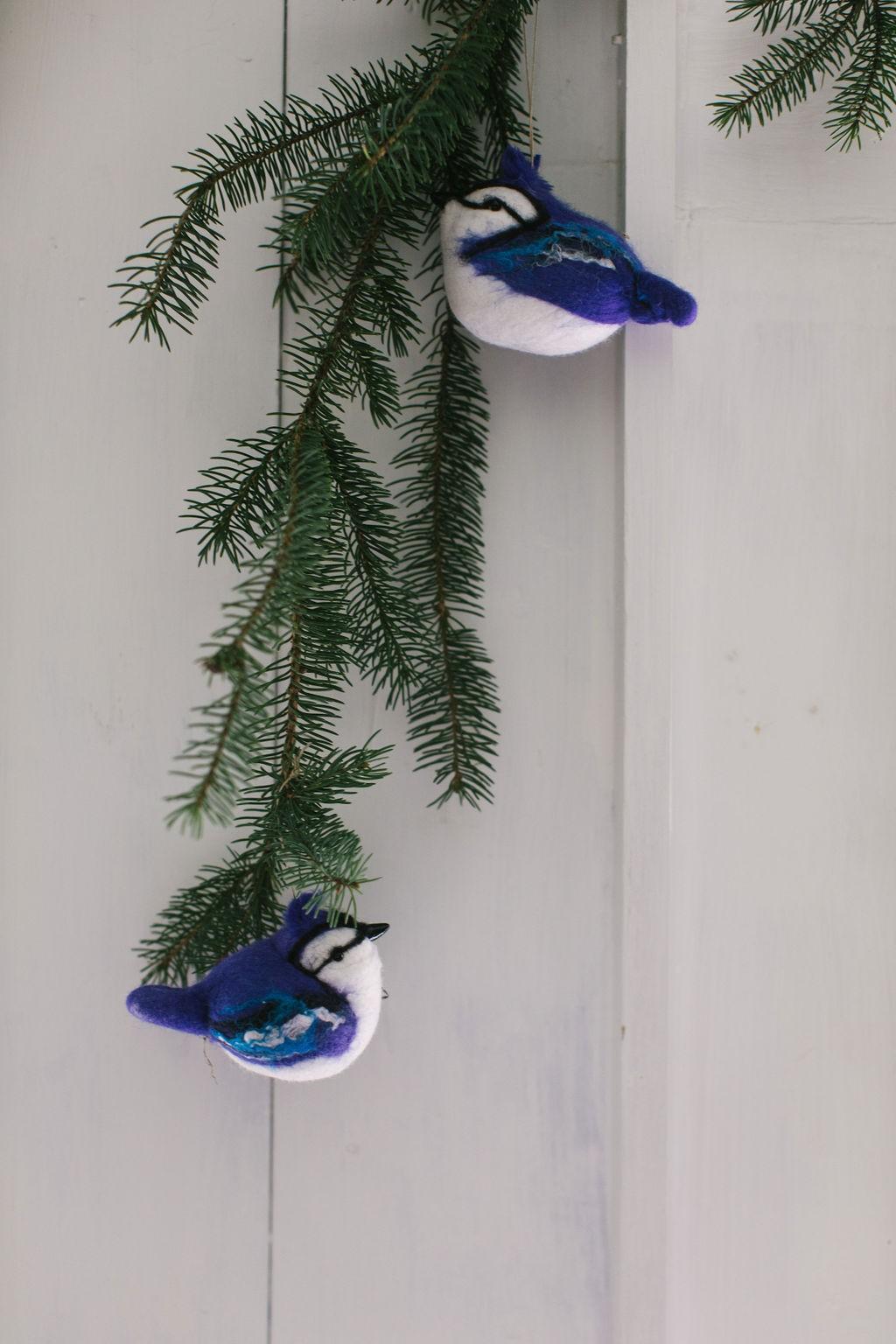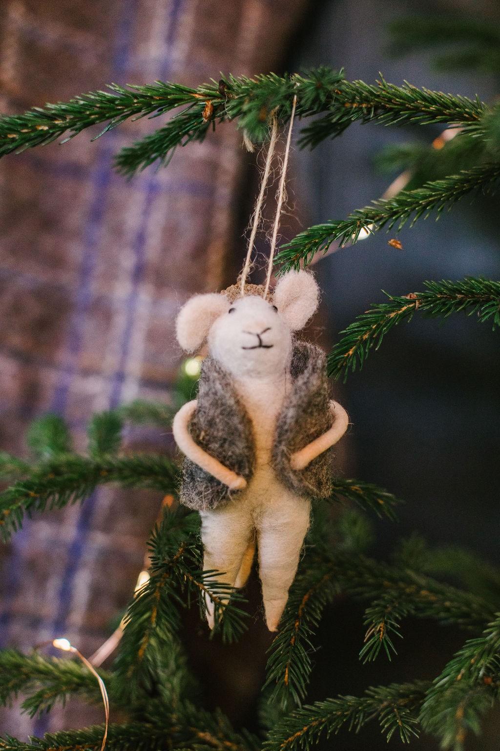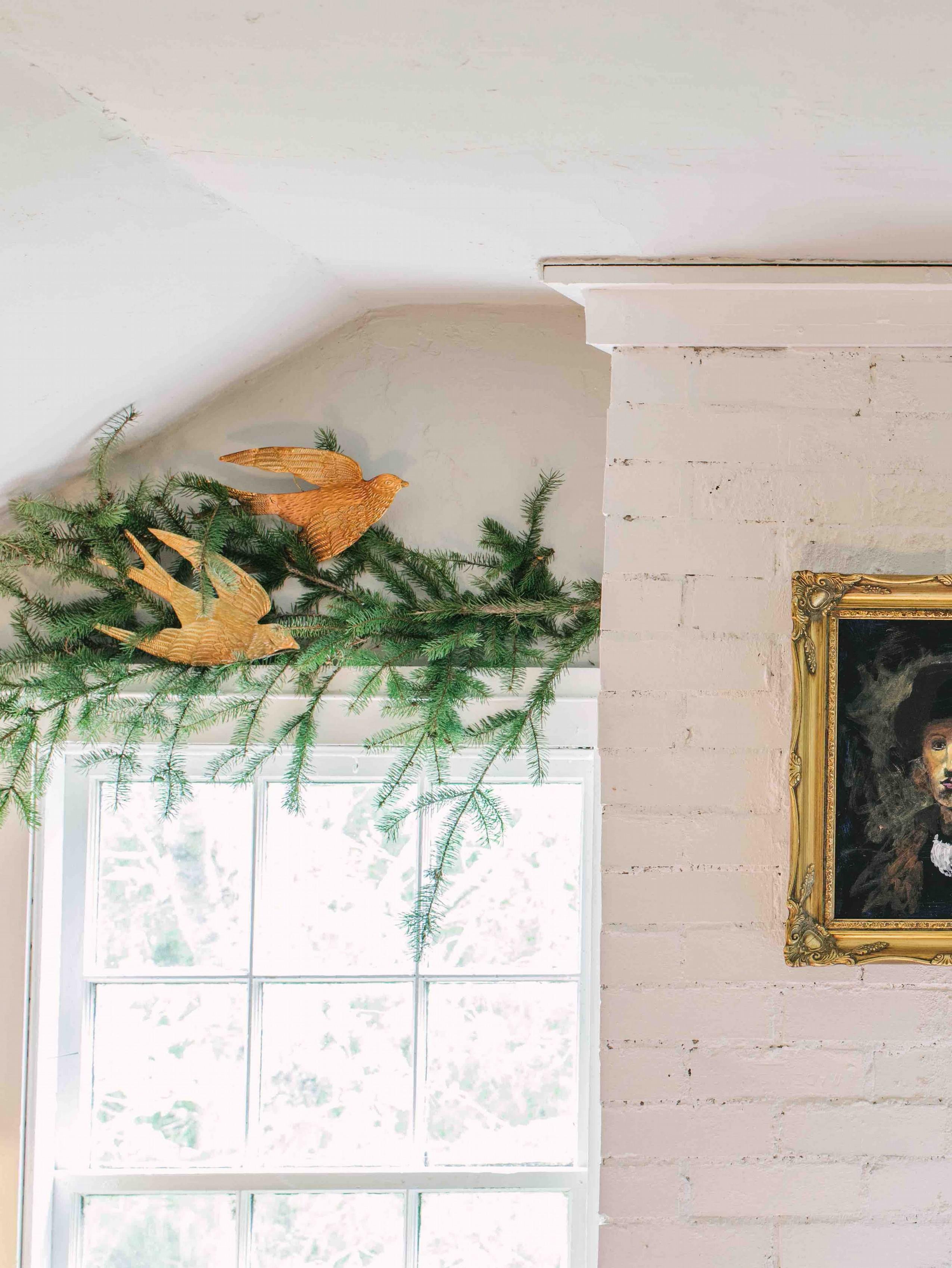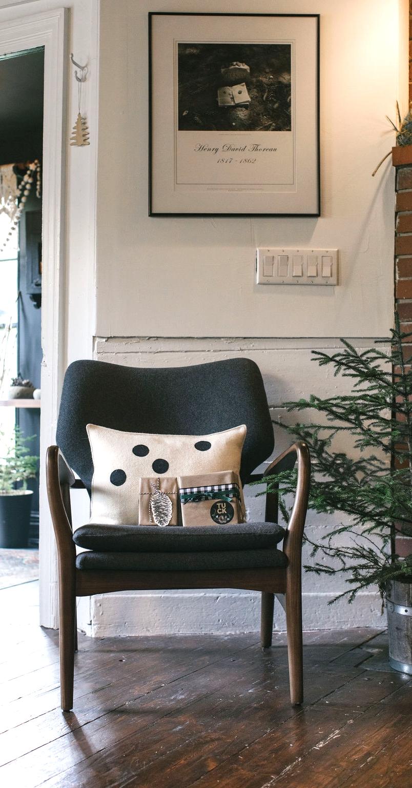 The curtain rods were left by the previous owners and I decided to just grab some fir branches and throw a few sparkly ornaments in for good measure. You’ll also note the bird cushion as well as the beautiful felted blue jays I bought a few years ago from Good Fibrations. (Since coming to the cottage we’ve become ‘bird’ people with an array of bird feeders out front to prove it. Along with measures to discourage the ever-industrious squirrels.)