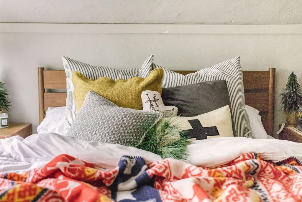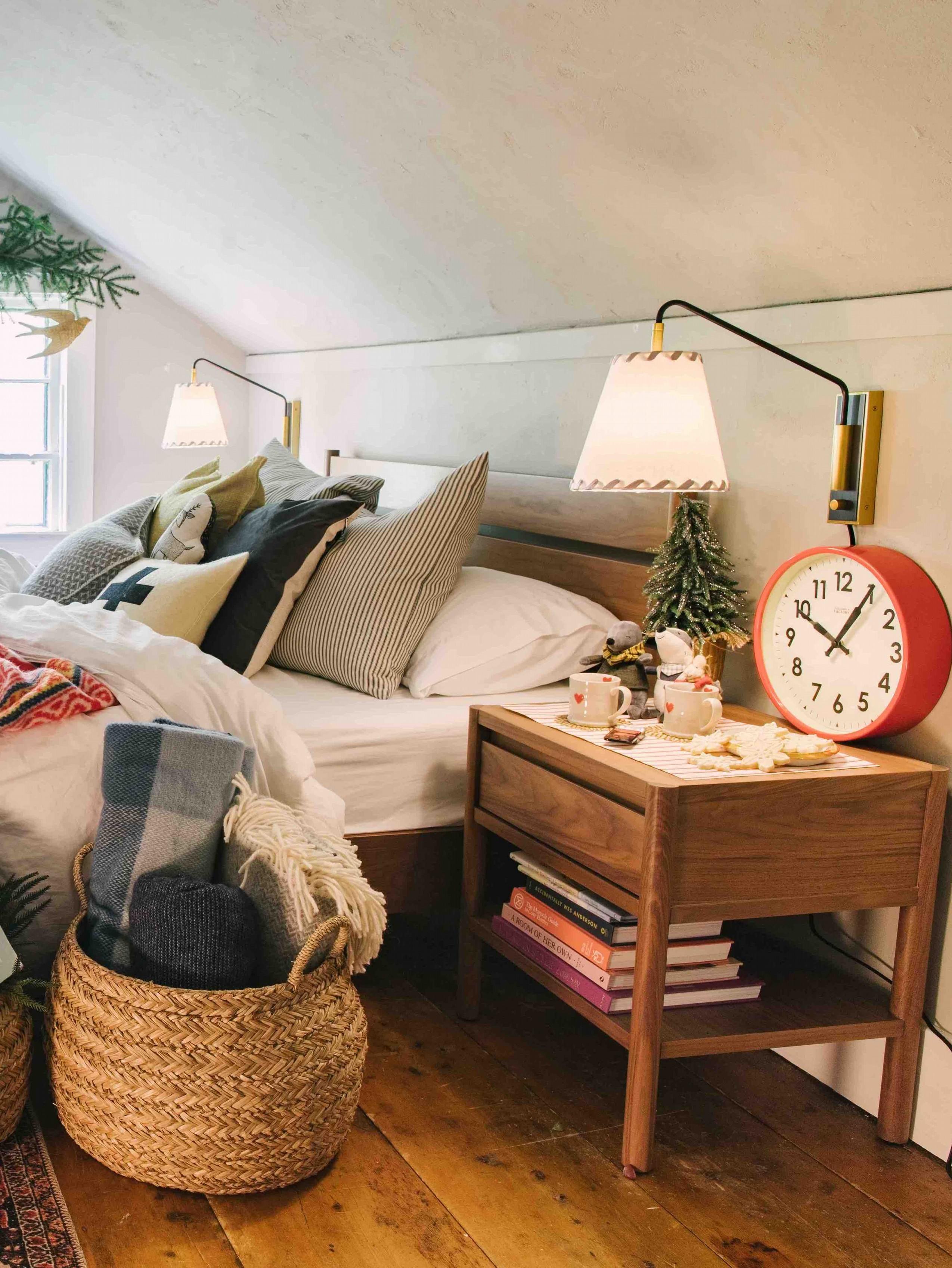 Klippan Cushions; Reindeer Cushion; Selena Linen Cushion Desert; Black Ticking Cushions; Applique Wool Pillow; Velvet Pom-Pom cushion (L, S); Klippan Sarek Eco Lambs Wool Blanket; Beaded Heart Gold (S, M, L); Festive Fir Trees (L, M, S); Monarch Single Drawer Night Stand, Walnut; Monarch Queen Size Bed, Walnut: Gus Gallery Tray, Walnut (or Ash); Loren Red/Navy Carpet