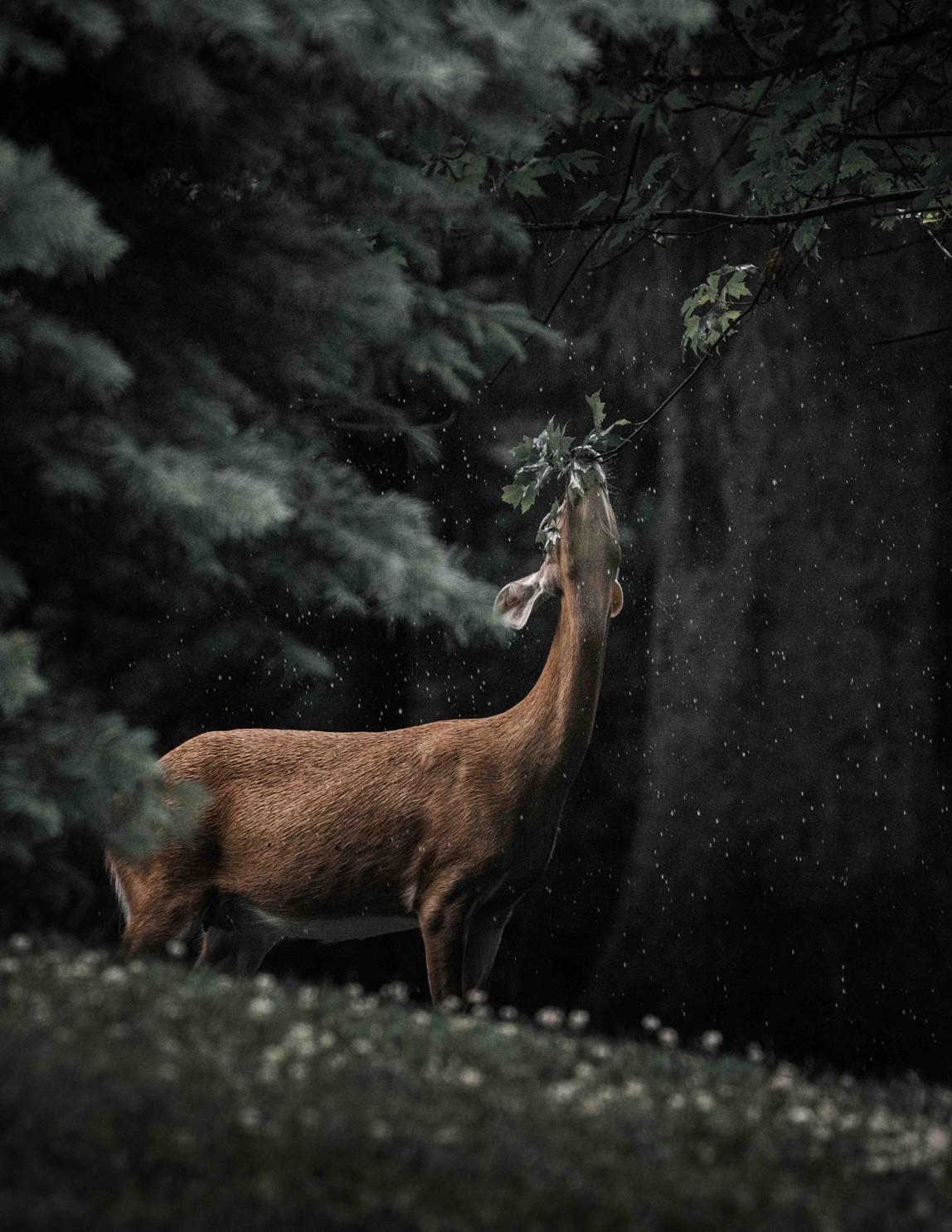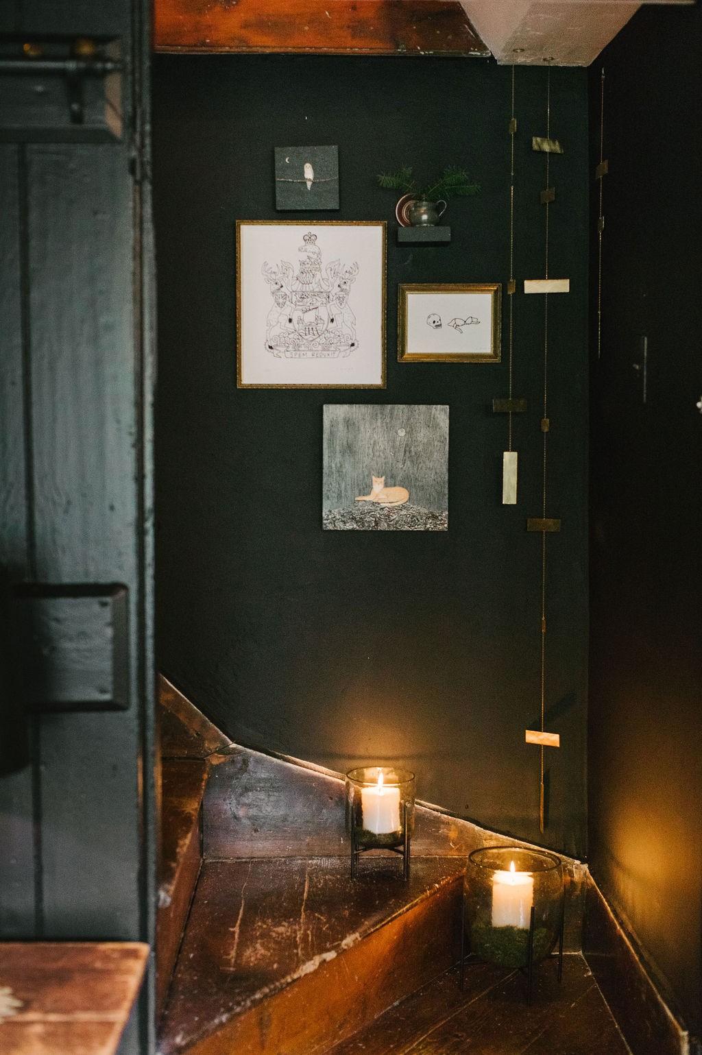 In keeping with the moody backdrop, I restricted myself to a fairly neutral palette consisting of foraged dogwood, tiny trees, moss, and fresh pine from the forest. Additionally, I’ve added a few rustic pieces such as an early New Brunswick barrel and a card catalogue that Robert bought in an antique store in St. Andrews. Ashley’s deer painting from her wilderness series fits in nicely, too. The rusted star was found in the barn on the property and I just stuffed some moss inside. Seems perfectly Christmas-y to me!
