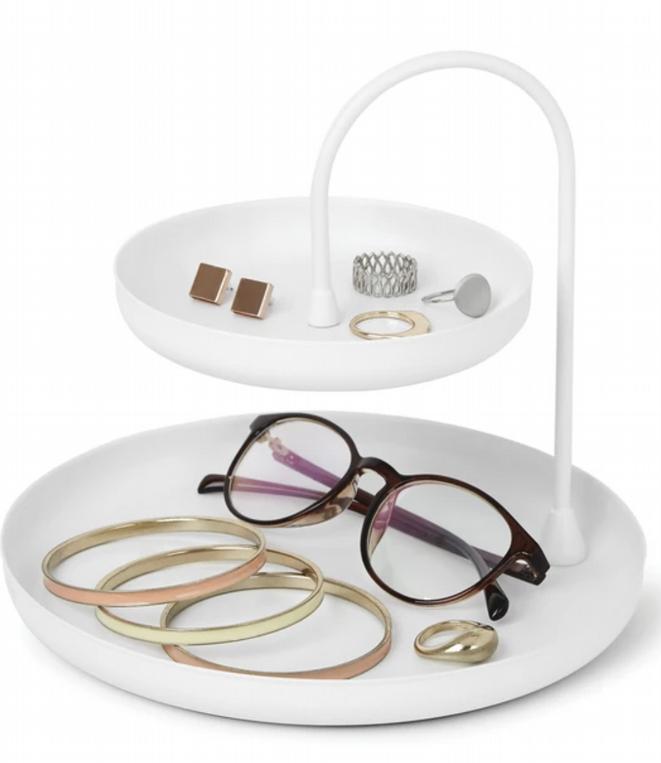 Poise Two Tiered Tray (two finishes); Tesora Jewelry Box (5 designs); Kaleidoscope Brass Placemat (available in other finishes)