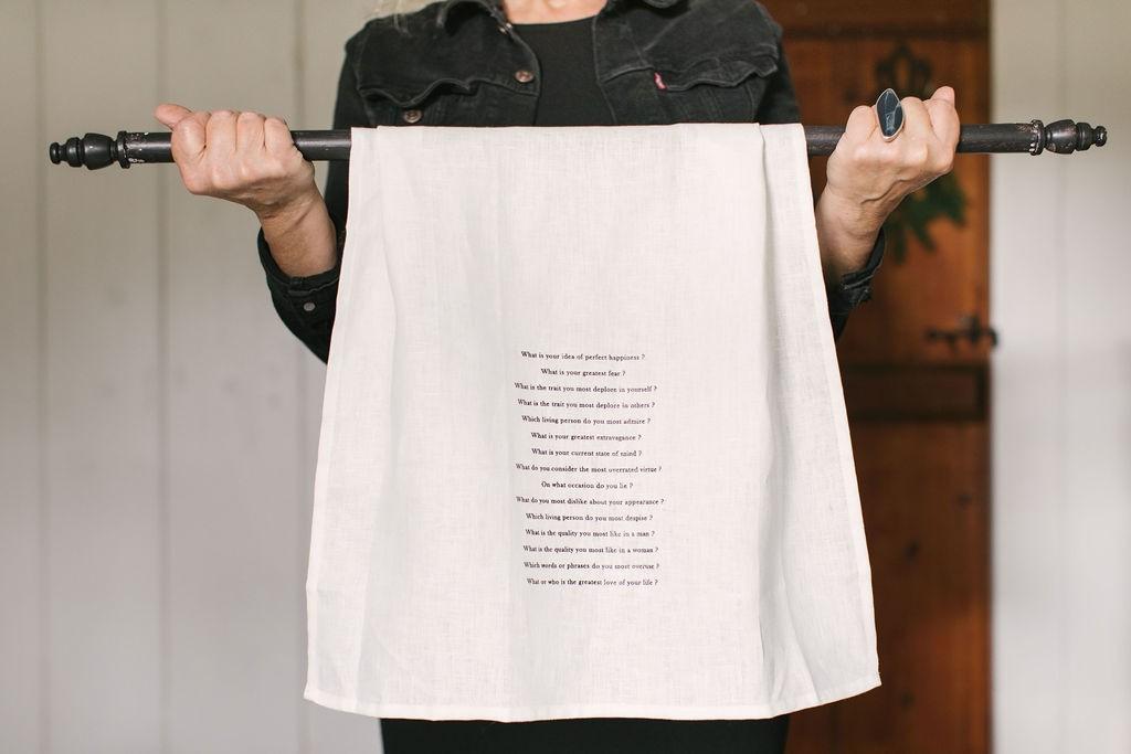 Each place setting has three (yes, three!) napkins: two paper and one special ‘Proust’ conversational napkin. It’s actually a tea towel but I steamed them and laid them as the ”anchor” napkin. (See detail on the next page.)