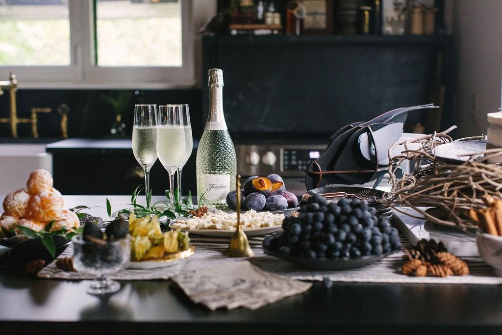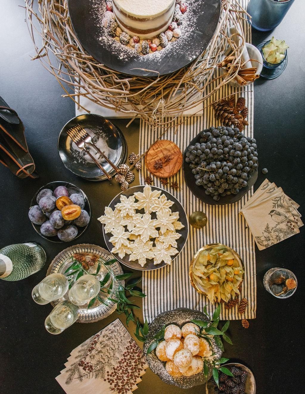 Julia Bustin, the wonderful pastry maverick of Saint John, created the beautiful French Baguette and a French twist with sprinkled Maldon Sea Salt to be nestled in amongst the blackberries, figs, plums, pears, and walnuts. The moody tones are perfectly in keeping with the foundational Winter Owl mats.
