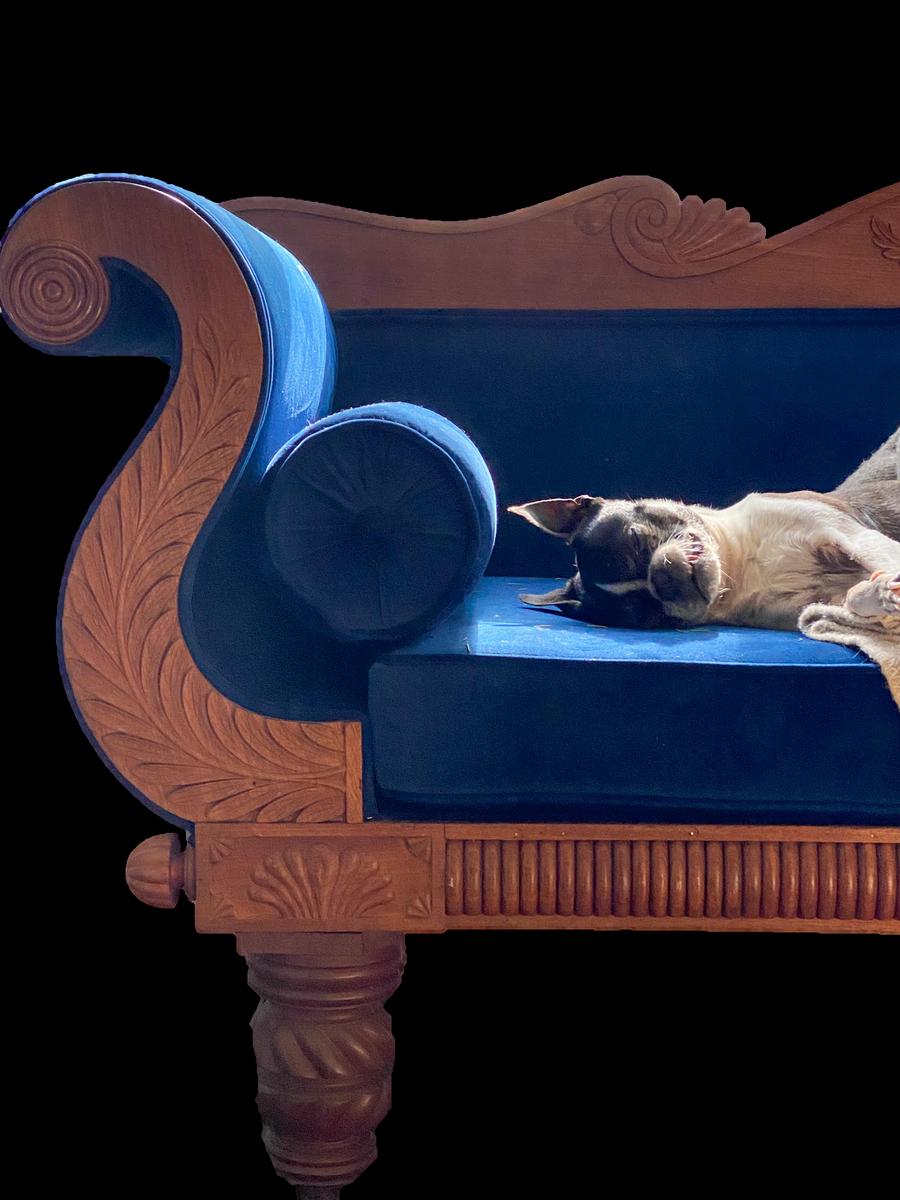 The settee currently sits in the dining room and provides a great spot for relaxing after eating too much and for Scout and Macey to look out the windows and survey their domain.