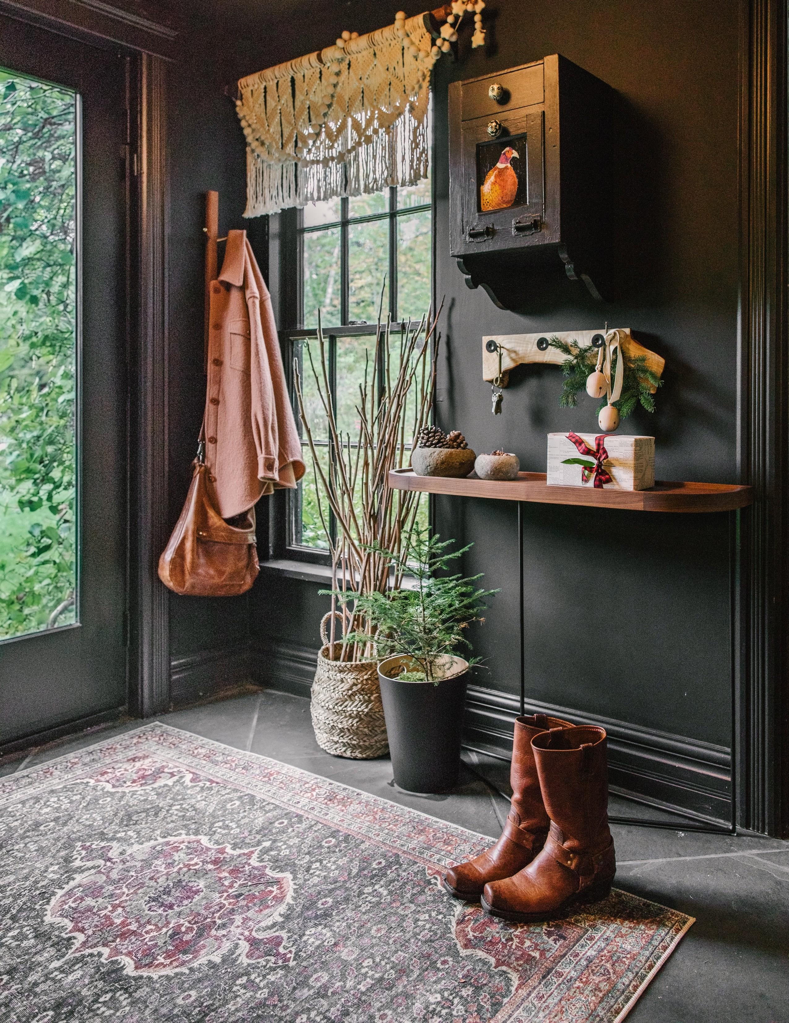 It’s astonishing how painting walls, ceiling and trim a warm black colour creates a sense of drama and intimacy in an entrance. I chose a complementary natural slate floor, layering all natural + textural elements where possible.