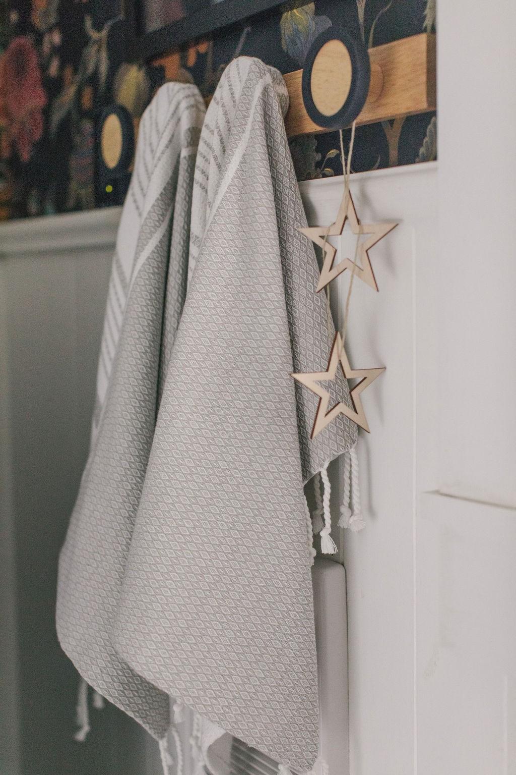 Turkish Tea Towels, Hand, Bath; Ryan Livingstone, Flowering Rush; Umbra Record Album Frame; Bag of Wooden Star Ornaments; Hub Rail 4 Hook; Wallpaper – House of Hackney Artemis.