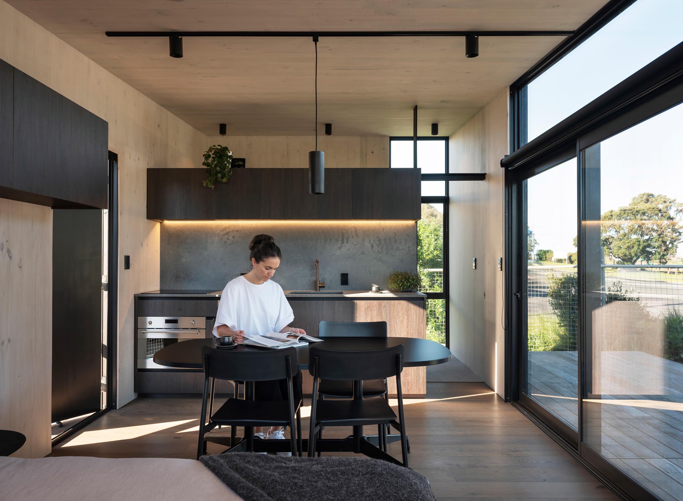 Compact, stylish, with smartly designed spaces and a thoughtful living plan, this modern home designed by Dorrington Atcheson Architects sits on one hectare and delivers the functionality and charm of a tiny house on steroids. Located minutes from Buckleton Beach and moments from Matakana Village, the location offers sweeping countryside and water views. Visually striking, in cedar shiplap weatherboards and concrete block, its features include concrete floors, white vaulted ceilings and exposed timber trusses; the added volume and sense of space giving a ‘light industrial’ feel to this contemporary New Zealand ‘small house’ north of Auckland. Comprising an open plan living pavilion that adjoins a covered outdoor room with fireplace, two bedrooms, two bathrooms, kitchen, dedicated office, plus a loft above the garage that is favoured more as a guest room than for storage and overflow. Internal access garage, plus carport and secure bike/toy shed. A ‘not too much’ but ‘not too little’ property for holiday or home in an outstanding location.