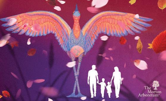 Beginning May 17, visitors to e Morton Arboretum will be greeted by a collection of five massive sculptures. e new exhibition, titled Vivid Creatures: Colorful Sculptures as Tall as Trees, is the work of artists Heather and Fez BeGaetz. e sculptures include a white-tailed deer, dragonfly, sandhill crane, fox squirrel, and a brittle button snail. ey range in size from eight to 23 feet tall. e artists focused on animals that either migrate through or are a part of the Illinois region. e artists make large-scale sculptures to provide a sense of creative possibility and participation. mortonarb.org