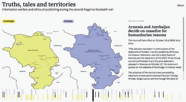 Interactive publishing timeline tracking media coverage on the 2020 Nagorno-Karabakh war.