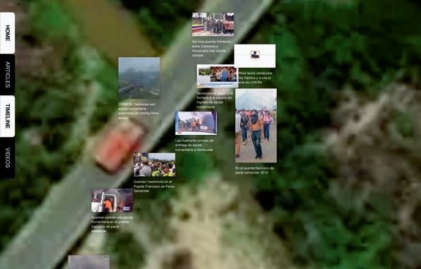 then two of the UN aid trucks were set on fire, presumably by followers of president Nicolás Maduro. Our group of students reconstructed the incident on the bridge and analyzed the different views covered by the news, including not only pro- and anti-Maduro activists but also the report ing of the Columbian and Venezuelan governments. By incorporating these nuanced narratives they recreated the actual cacophony of voices that blurred the line between reality and propaganda.