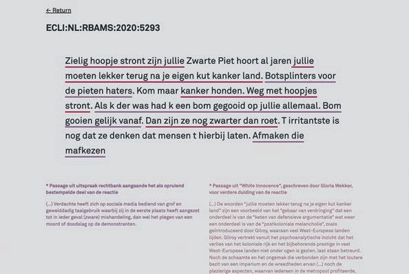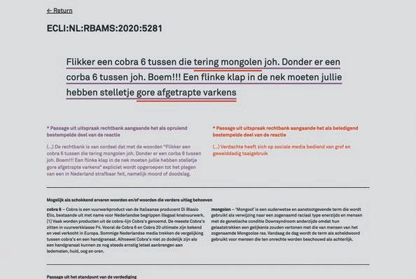 Daan Veerman investigates the 2020 hate speech trial related to Dutch journalist Clarice Gargard, in particular a selection of two hundred racist hate messages on social media. Through an educational game the project aims to understand how those who sent the messages were penalised. Through an interactive website, Daan documented the social media “comments” that were put on trial.