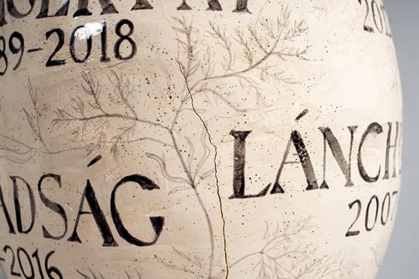 Clay urn with names of independent radio stations shut down by Hungary’s media authority.