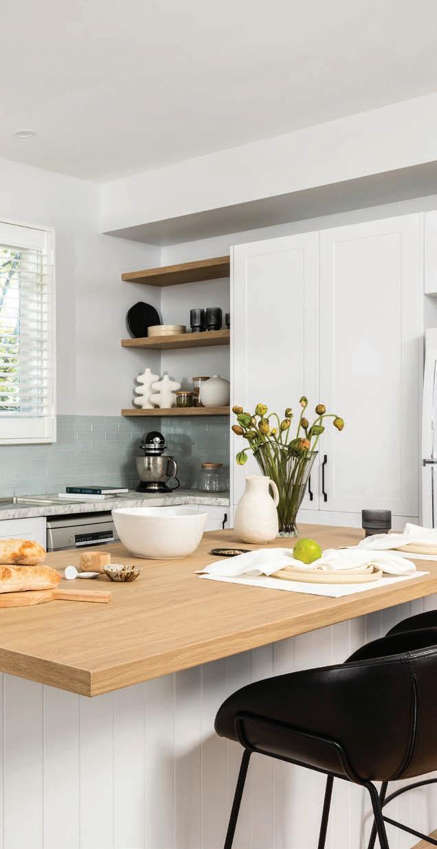 Creating a space full of farmhouse charm is all in the details. Timber bar stools and our timber-look hazelnut benchtops bring in warmth, with cup handles adding a rustic touch to complete the farmhouse aesthetic.