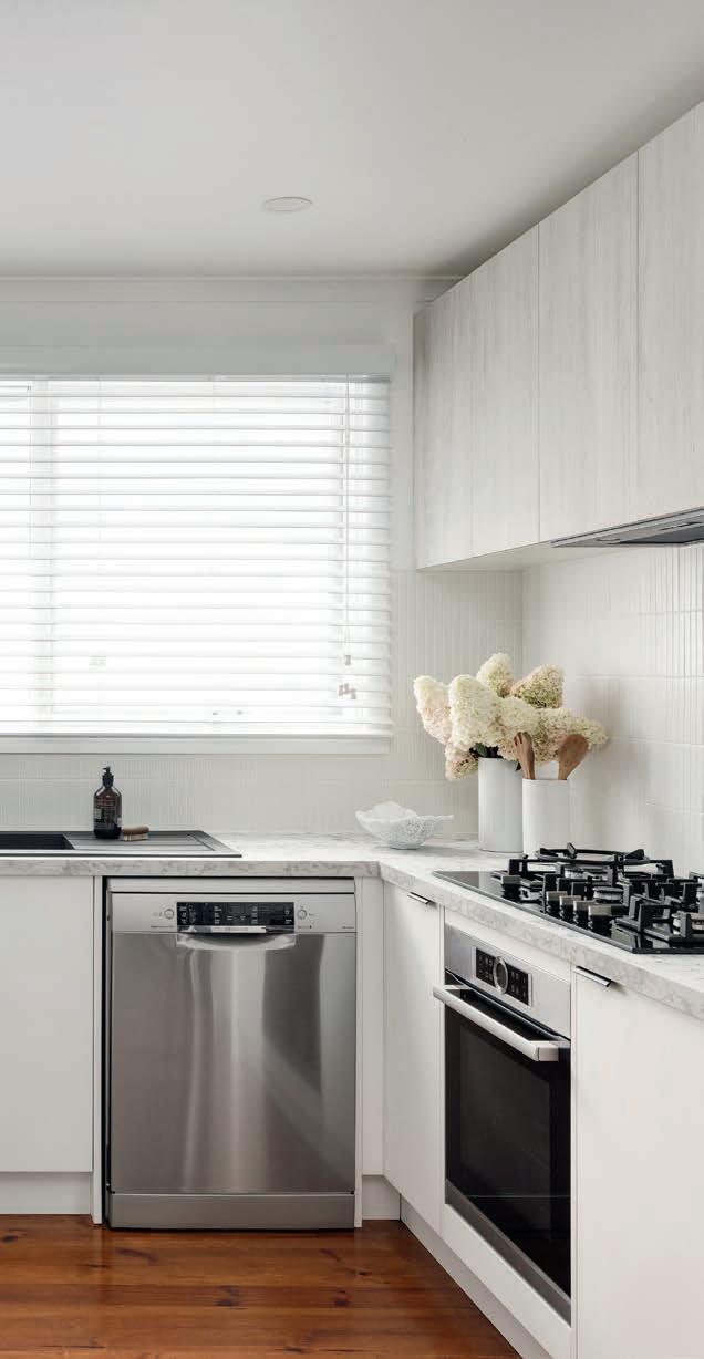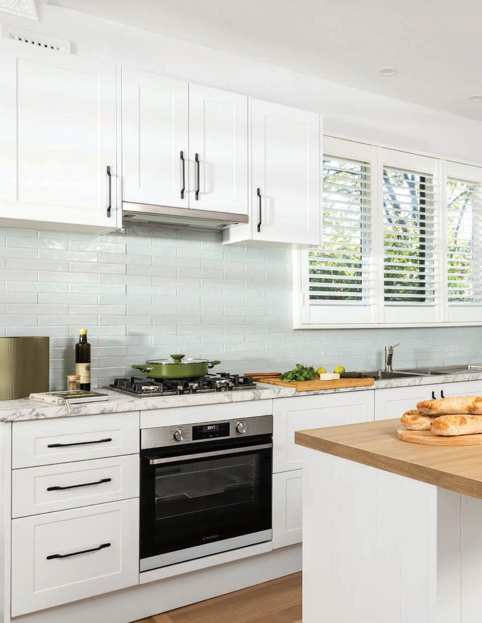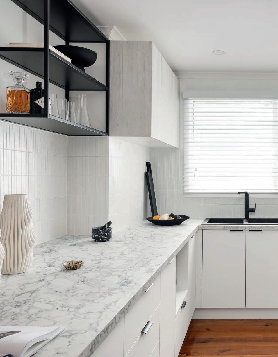 If you’re after a look that will stand the test of time, look no further than the classic combination of white doors and panels with stone-look benchtops. Add timber accents for a modern Scandi look that’s sure to please.