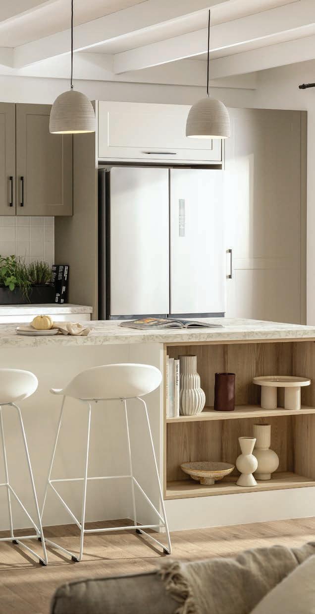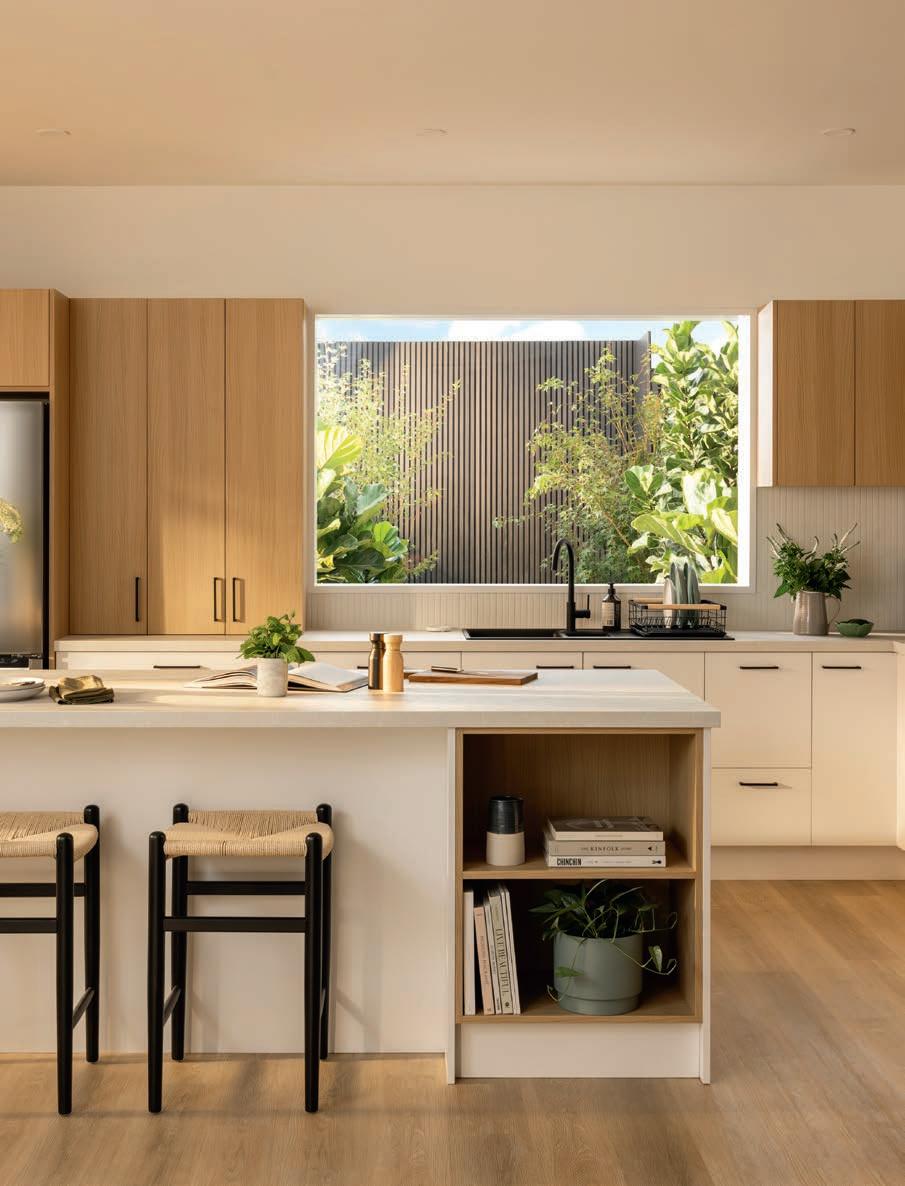 Combine a neutral colour palette, clean lines with flat cabinetry, and natural elements to achieve the ever-popular Scandi style. Create cohesion by matching feature doors and panels with the benchtops and open shelves.