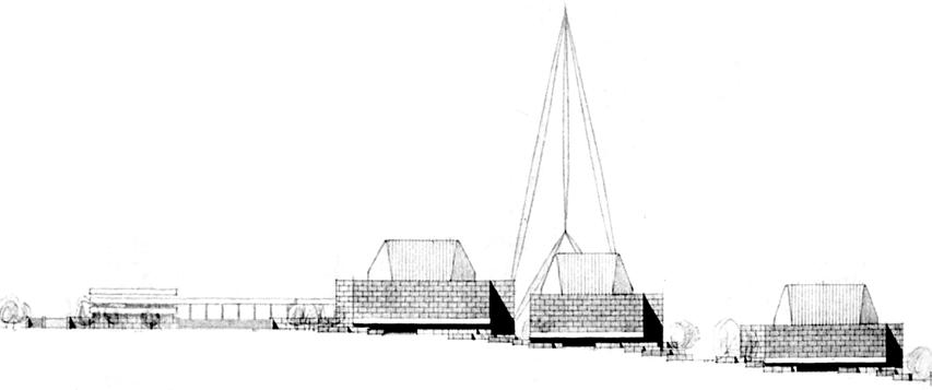 Jørn Utzon envisioned a composition of wooden bridges and platforms connecting a number of simple wooden houses with mono-pitched roofs supported by wooden posts. It has been reported, but not verified, that the basic idea for Utzon’s tentative composition of oblong buildings at Hammershus came to him during a visit to the Ganges River in India. Here Utzon admired how boats found their place in between each other in a highly complex, tentative but rational way that Utzon found very beautiful.