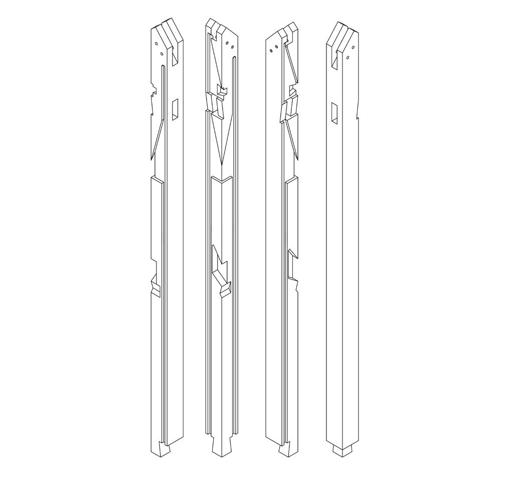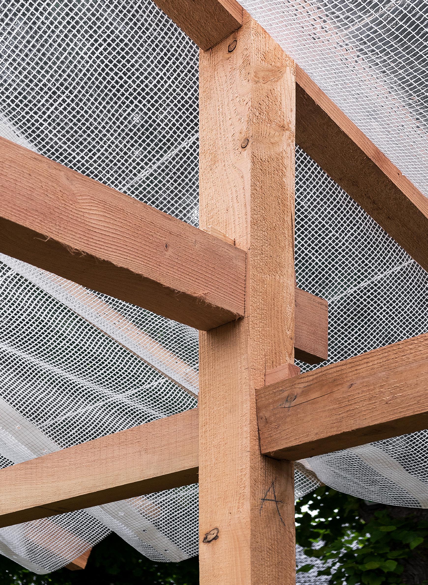 The creative and constructive development of the pavilions is based on a detailed study of traditional building techniques in timber construction, which do not require metal connecting elements. Their reinterpretation defines the design and leads to a contemporary architecture. Although the identical geometry and structure of the pavilions, the details are different and refer to the historical principles of the connection typical for the respective locations.