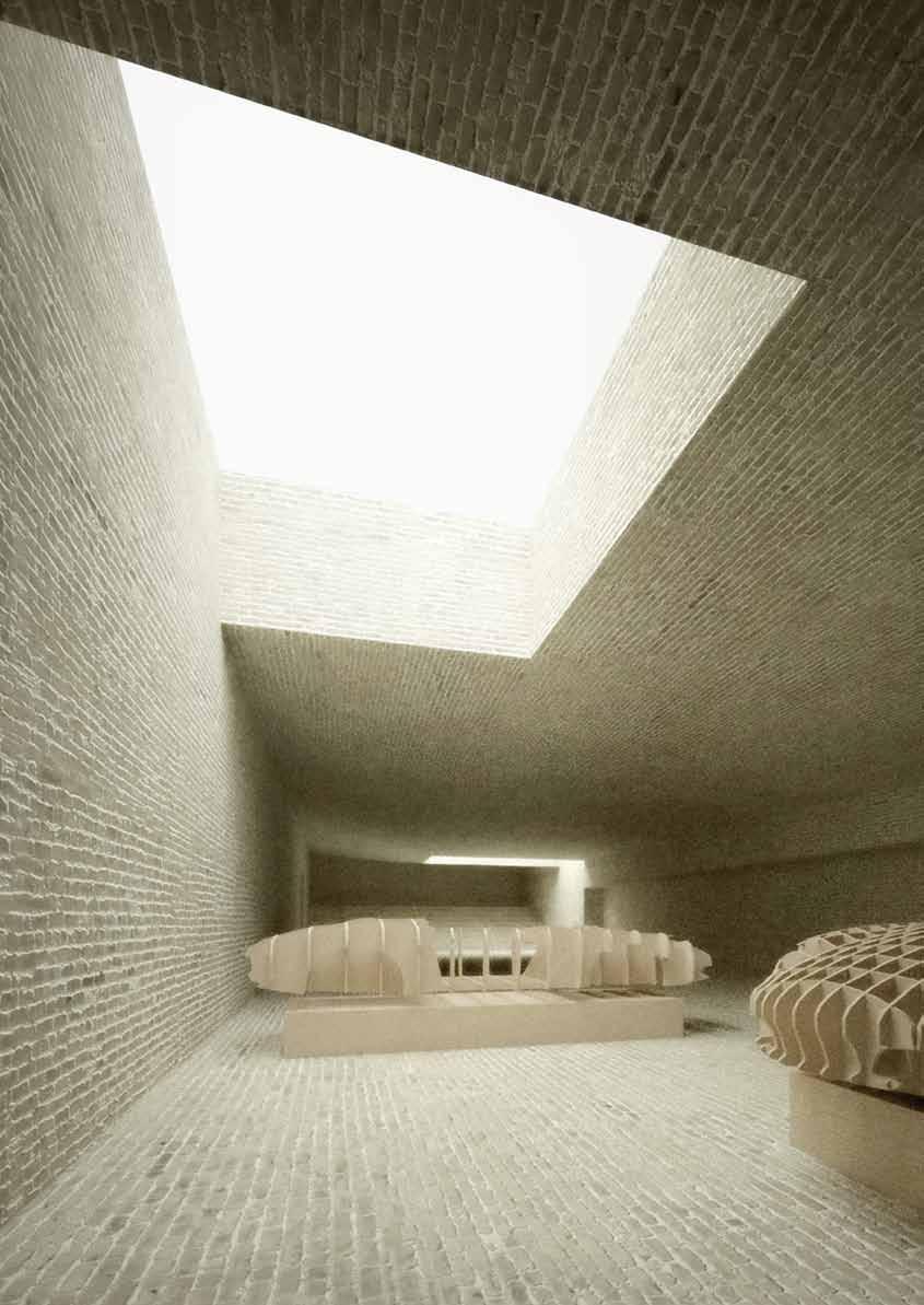 hængende udstillingssal for Designmuseum Danmark i København. Der er ingen forskel i de stoflige virkninger mellem rummets gulv, vægge og loft. De er holdt i samme teglsten og fugevirkning og også opmuringen af lysindtag er i samme stof og teknik.