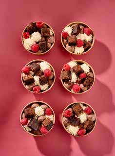 Koka till 135–140°C. Fördela bräcken i 4 kapslar, 45x60 cm med silpatmatta i botten. Dekorera 2 kapslar med mandel och hallon. Låt bräcken i de andra 2 kapslarna stelna. Temperera choklad och häll över bräcken, dekorera med mandel, marshmallows och tranbär.