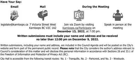 Let's Talk K amloops is our engagement website where you can share your voice and shape our city Please subscribe to the project of interest to receive updates. Sign up and speak up at: LetsTalk.Kamloops.ca.