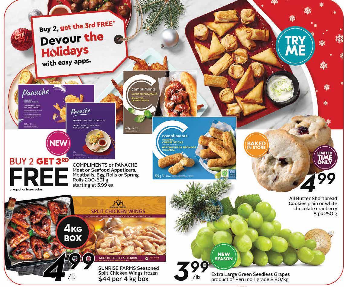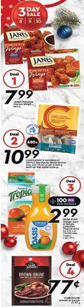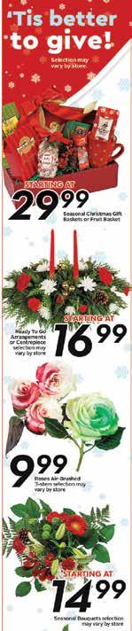 B20 WEDNESDAY, December 7, 2022 www.kamloopsthisweek.com ABERDEEN MALL 20- 1320 TRANS - CANADA HWY WEST • FRESHSTMARKET.COM apply online AT F R E S H S T M A R K E T . C O M Grow us with e s GROCERY PICKUP & DELIVERY AVAILABLE NOW! S H O P.F R E S H S T M A R K E T.CO M S H O P O N L I N E P R I C E S I N E F F E C T F R I D AY, D E C E M B E R 9 - T H U R S D AY, D E C E M B E R 1 5 B C F r e s h R e d & Y e l l ow Po t a t o e s 2 2 7 k g 4 99 E A 2 $ 4FOR 299 lb Green Giant Frozen Vegetables 750 g 99 each 299 each Nanaimo Bars 220 g YOU DESSERT THE BEST 99 99 5 lb H o l i d ay P u n c h 32oz cranberry juice 2 cups orange juice 1 bottle Sparkling Apple Cider 2L ginger ale Optional Garnishes: orange slices, fresh cranberries, rosemary, anise Pour all ingredients into a punch bowl and stir well to combine. Top with gar nishes. Makes 14 cups Tropicana Orange Juice 2.63 L plus deposit & recycle fee LOCALLY RAISED BC Grade A Turkeys frozen • all sizes individually priced 599 each first of the season P e a r l m a r k W i l d A r g e n t i n i a n J u m b o S h r i m p f r oz e n 2 1 / 2 5 c o u n t 4 54 g 1 4 99 E A