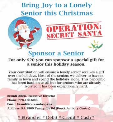 To donate to the Cheer Fund, click on the KTW Christmas Cheer Fund logo at www.kamloop sthisweek.com, go to bcicf.ca/ kamloops-this-week-christmascheer-fund or drop in to KTW’s office at 1365B Dalhousie Dr., week days between 8 a.m. and 4:30 p.m.