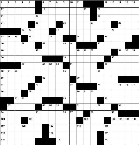 WEDNESDAY, December 7, 2022 B19 www.kamloopsthisweek.com ACROSS 1. Tot s rocker 6. Gets lost 12. Squeeze as a mop 17. Die down 18. Eventual outlet for Lake Victoria 20. Joan of Arc for one 21. Geometrophiles .?.?. 23. A little off? 24. Abound (with) 25. Member of a colony 26. Rapture 28. Put down in writing 29. Sad 31. Imagophiles .?.?. 33. Old ‘ The beer of quality ’ sloganeer, in brief 36. Actress Witherspoon 38. ‘ You wanted to see me?’’ 39. Cabaret accessories 40. Something you sleep through 42. Sunny-side -up ‘suns’’ 45. In stitches 46. Gastrophiles .?.?. 51. ‘ The Eagle landed’’ 54. Close out 55. Ready for a drive 56. Rightmost menu heading often 57. Long campaigns 61. Org that par tners with Lyft and Uber to promote safe ridesharing 62. ‘Ish’’ 63. Dextropodophiles .?.?. 68. Come after 69. Nugget from a noggin 70. Sinister smiles 71. Novosibirsk negative 72. Come out of la-la land with a jolt 74. To whom it is said ‘‘ You have a grand gift for silence .?.?. I t makes you quite invaluable as a companion.’’ 78. Small parlor piece? 79. Autotumulophiles ?.?. 83. Bird-feeder fat 85. Symbol of laziness 86. High winds 87. Actress Rowlands 88. PC component 91. Even slightly 93. ‘‘Inside the N.B.A.’ channel 94. Aurophiles ?.?. 98. The that bind 100. Cer tain fluenc ybuilding subj 101. Game with cestas and a pelota 102. Rule true crime writer 103. Peripher y 107. Tap 109. Chronomec -hanophiles ?.?. 112. Feel like [grrrr] 113. Take care of business 114. Goosebump inducing 115. Actress K aitlin of ‘I t ’s Always Sunny in Philadelphia ’ 116. Schnozzes 117. Palatial DOWN 1. ‘Go no fur ther!’’ 2. High wind 3. Go on and on (about) 4. Par ts of flutes and flowers 5. Still 6. I t s a bad look 7. Palaver 8. Kylo of ‘Star Wars 9. Red state? 10. Vanilli (1980s-’90s R&B duo) 11. Sordid 12. Poseurs 13. Monopoly proper ties that don’t get hotels, for shor t 14. Sandwich that may include salami, prosciutto and soppressata 15. Stock ings 16. Basketball coach Popovich 19. Lauder of beauty products 20. Secure as a sk iff 22. Zoom 27. Passpor ts, e.g., in brief 30. Private affairs? 31. Pummel as with snowballs 32. ‘‘ That was unexpected!’ 33. Things Acrobat Reader reads 34. Hill by a loch 35. ‘‘Seasons of Love musical 37. .?.?. .?.? 41. Seeks attention, in a way 43. ‘Kraz y ____’ 44. Sarcastic response to a complaint 45. Longtime NASCAR sponsor 47. Habitat threatened by bleaching 48. Brings up 49. Extra something 50. What might accompany a wink 52. Choral voice 53. Minor disagreement 56 New