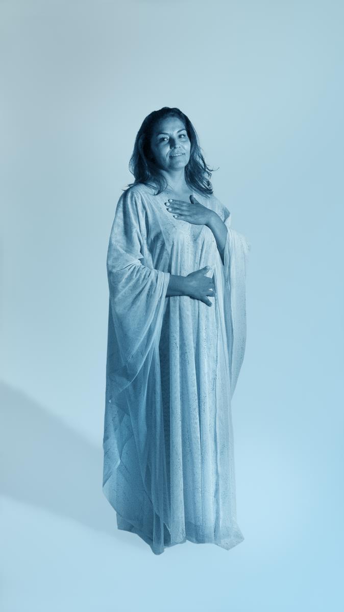 When we began the photo shoot, I was out of my comfort zone. Normally, I wear black. I do not wear white, do not wear dresses, nor do I go sleeveless. I always have my glasses on and wear jewelry. It is my gear and always has been. I always want to control the way I look, how I dress, and how I want to be perceived as a woman and as an artist. I was truly challenged in the name of art. I let my guard down, felt exposed, had insecurities, and body shame. I was glad to have been pushed out of my comfort place. This was a form of feminist liberation for me.