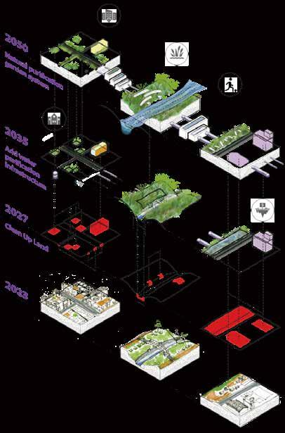Due to the difference of the types of pollutants, there will be three strategies to deal with different conditions. In order to create a robust and stable urban ecology at the waterfront, this project shifts the market-based planning to river-based planning, an ecological and sustainable way of moving forward.