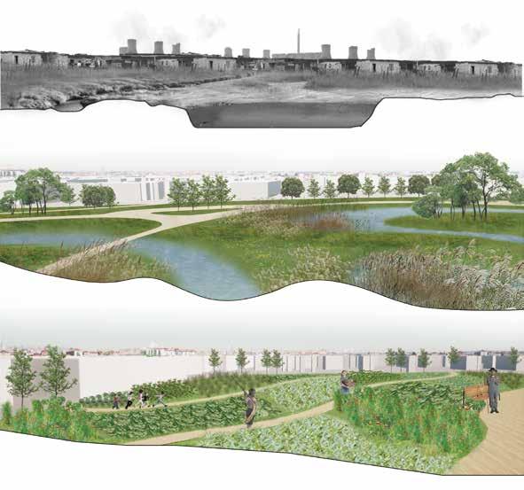 The main concept of this project is to extend the river bank and transform the concrete canal into natural landscape with softening materials and improved green infrastructure. And most importantly, bring this environment into the urban fabric and be accessible to local people.