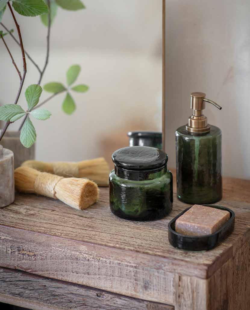 | 2.5 x 13 x 9cm £12.00 3. Asana Marble Storage Jar Grey | Marble | AS2001 | 11 x 8.5cm (dia) £35.00 4. Ilcoso Recycled Hammered Glass Soap Dispenser Amber | Glass | IB0401 | 10.5 x 7cm (dia) £25.00 5 NEW Ilcoso Recycled Hammered Glass Soap Dish Amber | Glass | IB6601 | 2