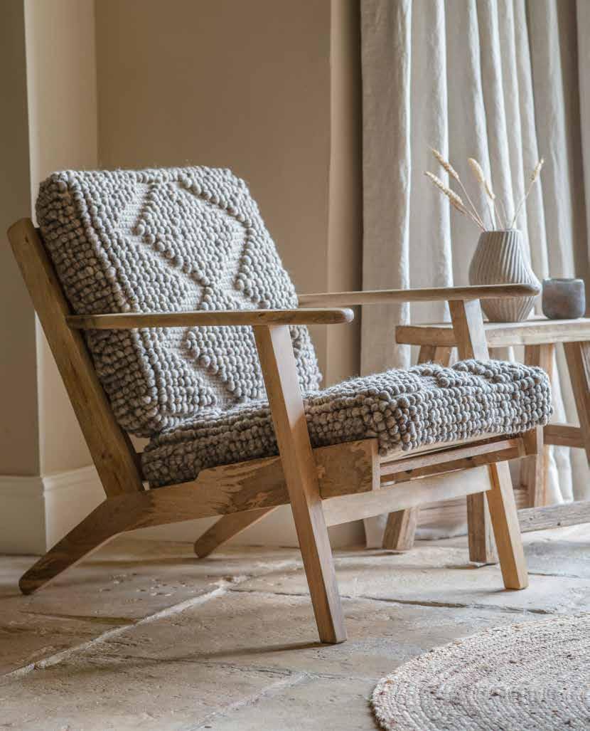 2. Surat Woven Lounger Natural | Acacia | SU0401 | 73 x 69 x 73cm £650.00 3. NEW Dantri Jute & Cotton Cushion Cover Soft Grey | Jute | DA1302 | 50 x 50cm £55.00 4. NEW Dilli Wool Throw Dark Brown | Wool | DI1201 | 120 x 170 cm £125.00