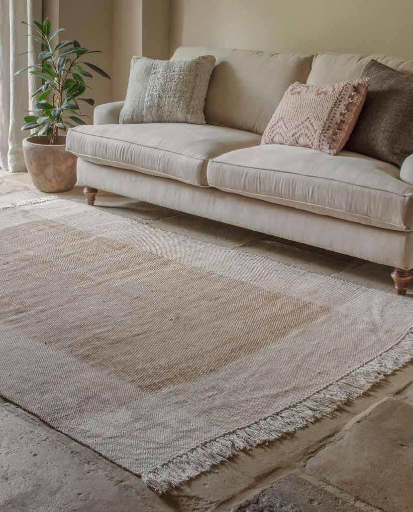 1. NEW Kufri Jute Rug Soft Blue & Brown | Jute | KU2002 | 150 x 240cm £395.00 | KU2003 | 200 x 300cm £550.00 2. NEW Akari Jute & Cotton Rug Natural | Jute | AK1601 | 66 x 200cm £125.00 | AK1501 | 120 x 180cm £195.00 | AK1502 | 150 x 240cm £295.00 3. NEW Andro Jute & Cotton Rug Natural | Jute | AN1401 | 66 x 200cm £125.00 | AN1301 | 120 x 180cm £195.00 | AN1302 | 150 x 240cm £295.00 | AN1303 | 200 x 300cm £550.00 4. Kittale Wool & Recycled PET Rug Dusty Pink | PET | KI0201 | 120 x 180cm £295.00 | KI0202 | 150 x 240cm £495.00 5. Bidiru Wool & Recycled Cotton Rug Black & Off White | Wool | BI0101 | 120 x 180cm £295.00 | BI0102 | 150 x 240cm £495.00 6. NEW Khanna Jute & Wool Rug Natural | Jute | KH1801 | 120 x 180cm £325.00 | KH1802 | 150 x 240cm £525.00 7. Braided Hemp Rug Natural | Hemp | BR0103 | Extra Large 200 x 300cm £550.00 8. Gitika Cotton & Hemp Rug Natural | Cotton | GI0101 | 120 x 180cm £250.00 | GI0102 | 150 x 240cm £395.00 | GI0103 | 200 x 300cm £595.00 9. Ailan Wool Rug Natural | Cotton | AR1301 | 120 x 180cm £295.00 | AR1302 | 150 x 240cm £495.00