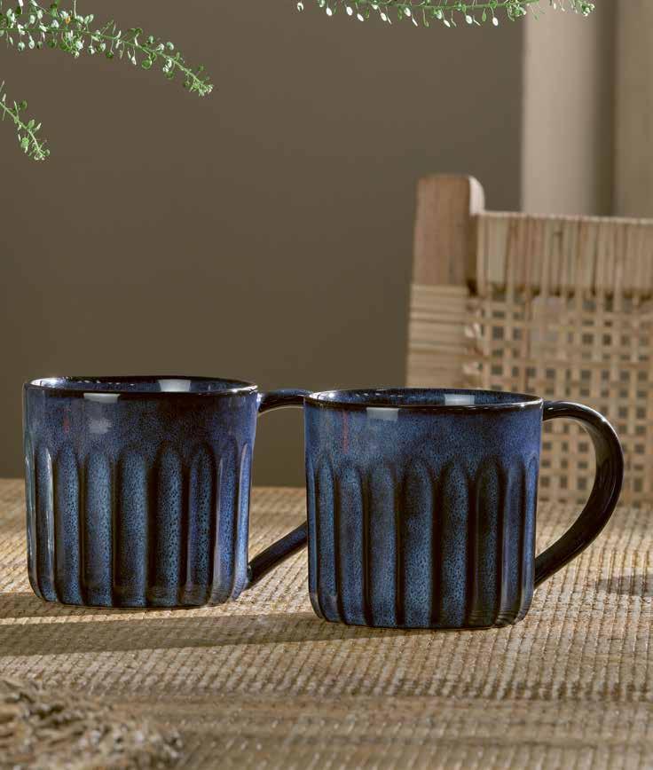 Right: Pawi Mango Wood Tray Round Natural | Mango Wood | PT3301 | 5 x 46cm (dia) Naryla Lantern Mango Wood & Glass | Mango Wood | NL0901 | Small 14 x 13cm (dia) Indigo Drop Mug – Set of 2 Cream & Indigo | White Clay | IM1501B2 | Small 6.5 x 8cm (dia)