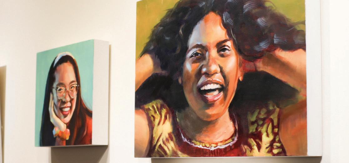 Students and teachers mingled around as the artists explained their work. Ya Yun Lin, a senior majoring in fine arts from Taiwan, painted 29 portraits of varying sizes of girls smiling. Combining both acrylic and oil paints to create the finished work, Lin said, “I am hoping to give viewers positive feelings through my art.”