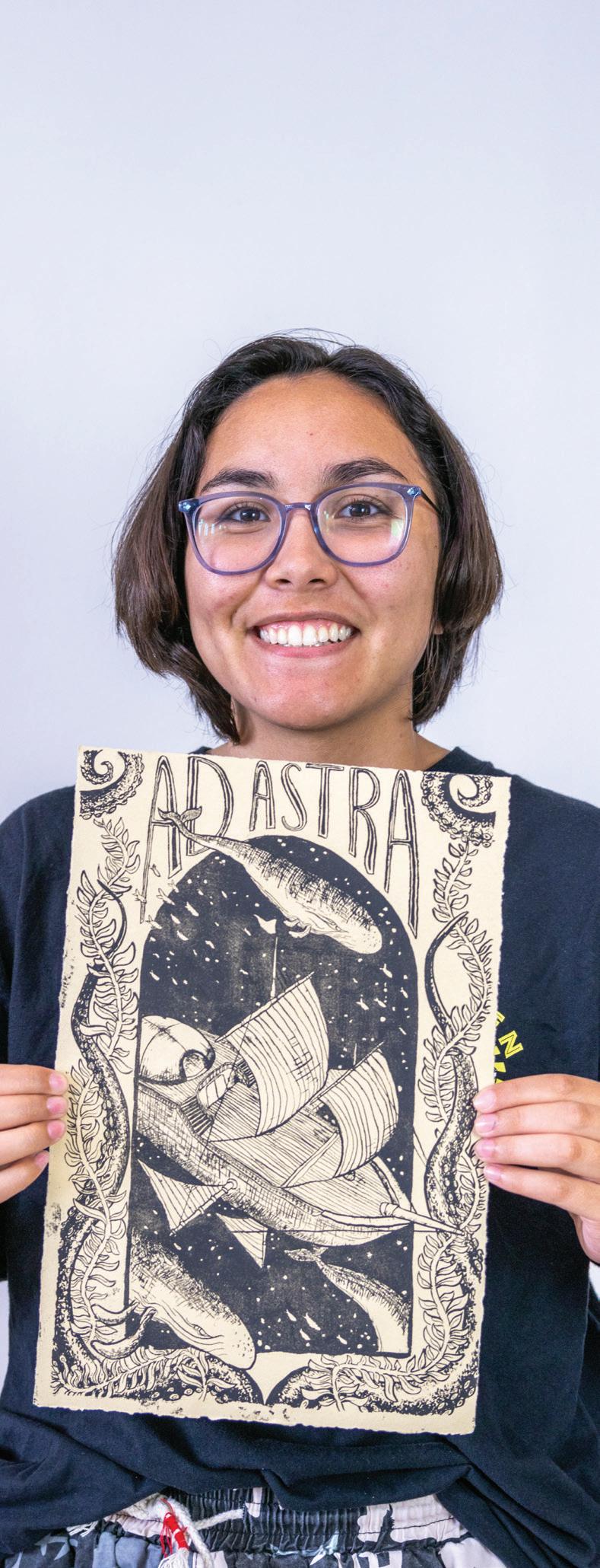 Elinor Cash, a junior from Illinois majoring in graphic design, said she created a set of prints inspired by a Latin phrase “Adastra Peraspa” which translates to, “to the stars through difficulty.” Cash said she really likes fantasy and was inspired by locations and fantastical elements from “Dungeons and Dragons.” “I’m a huge nerd,” Cash explained. Through this inspiration and her creativity, she created fantasy ships and said she thought it would be interesting to have one ship represent ocean and space and the other represent earth. The first print, “Adastra,” includes whales, water and the sky. The other print, titled “Peraspa,” features mushrooms and mountains. Cash’s prints are pictured on the right.