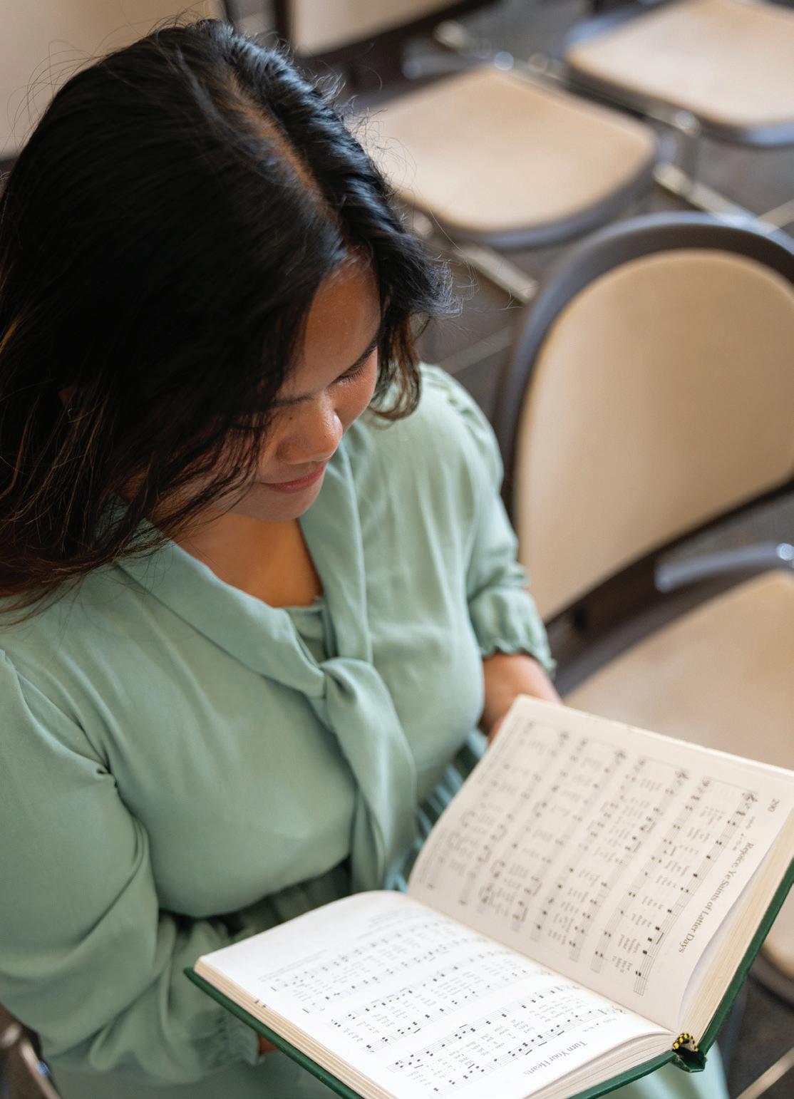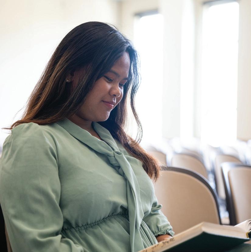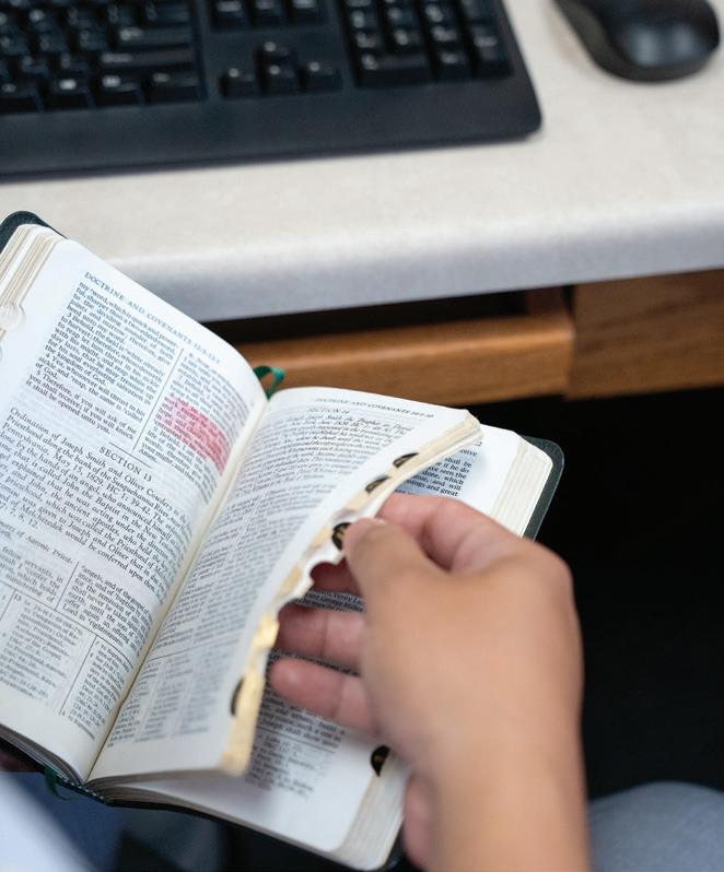 She said she worked on her attitude and her mindset about life. “I tried really hard to embody the light and love of Christ for everyone around me,” said Divine. She said missionary work is all about sharing the gospel through work and through Christlike love. • Belle Divine reading her scriptures on