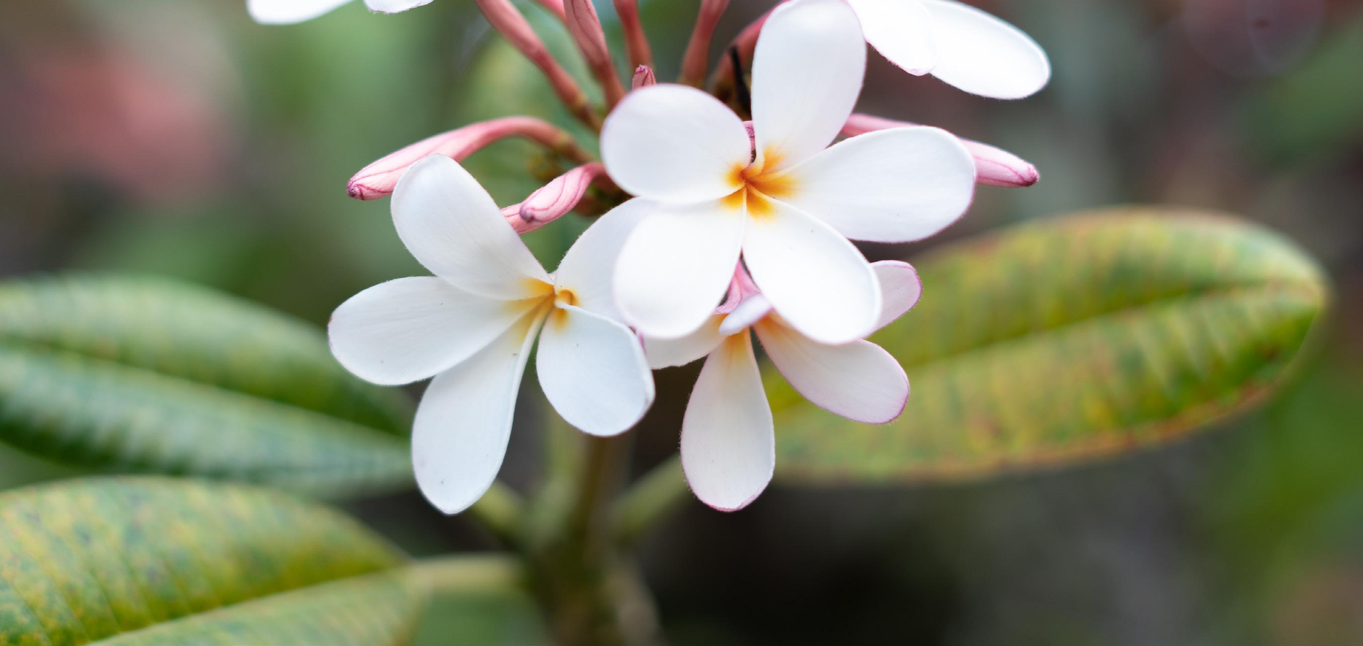 Front: Portrait of Tenille Nagareda-Ruben, Nadia Yoshizumi and Hope Iokia (left to right). Back: Close-up of a plumeria. Photos by Uurtsaikh Nyamdeleg.