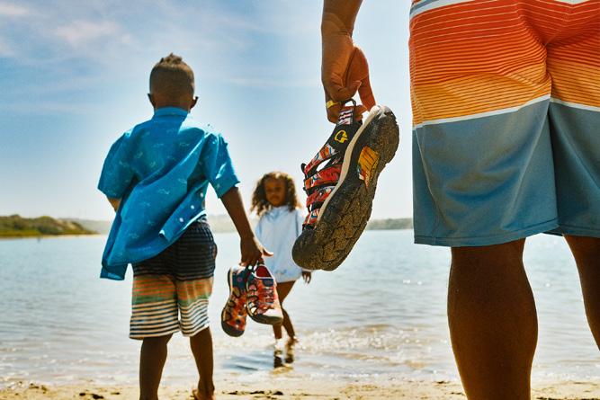 耐久性は持続可能性の一部であり、多用途性や快適性もまた持続可 能性の一部です。なぜなら、このような要素がそろっていること、すなわ ち履き続けられるシューズを持つことは、シューズを履く人にとって非 常に重要です。KEENがすべてのシューズで、試し履きの試験やフィッ ト性の試験を繰り返しているのはそのためです。KEENの研究所に、 シューズを100万回屈曲させる、あるいはシューズを履いて水中を歩 くといった状況をシミュレーションするマシンがあるのも、開発者たち がPCT(一対比較テスト)で試作品を履いているのもそのためです。ま た、KEENのコンフォート・フィットに指をゆったり伸ばせる余裕があ るのも、私たちがハイブリッドを好むのも快適性や多用途性を重視し ているからなのです。一足で複数の目的を果たせるシューズを作れば、 あなたが買うべき靴の数は少なくなる。そう、そこがスローファッション のいいところです。