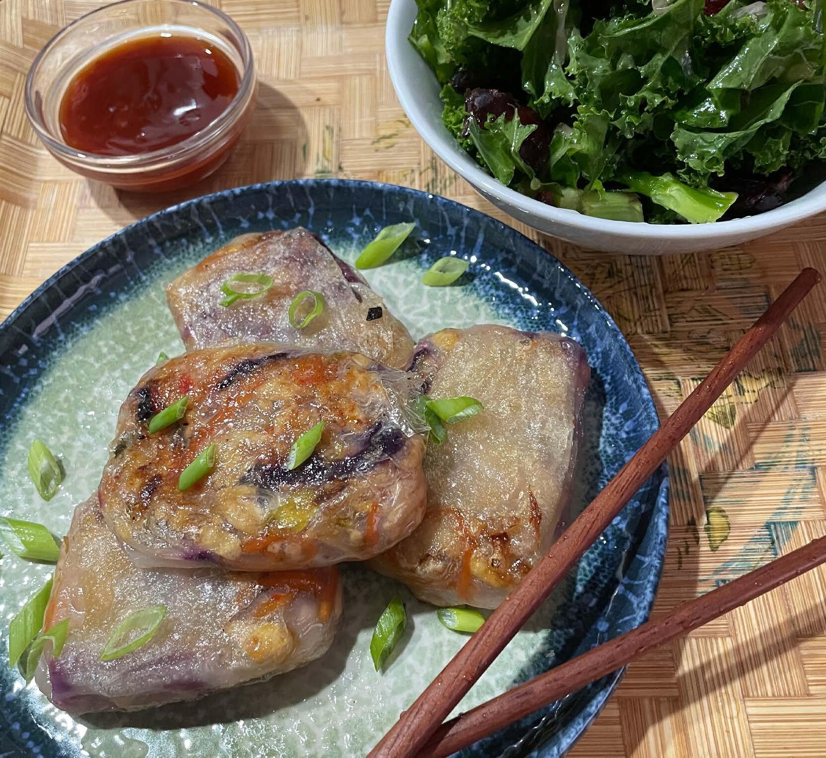 VEGAN RICE PAPER ACKEE DUMPLINGS, SERVED WITH SWEET CHILLI DIPPING SAUCE AND A KALE SALAD