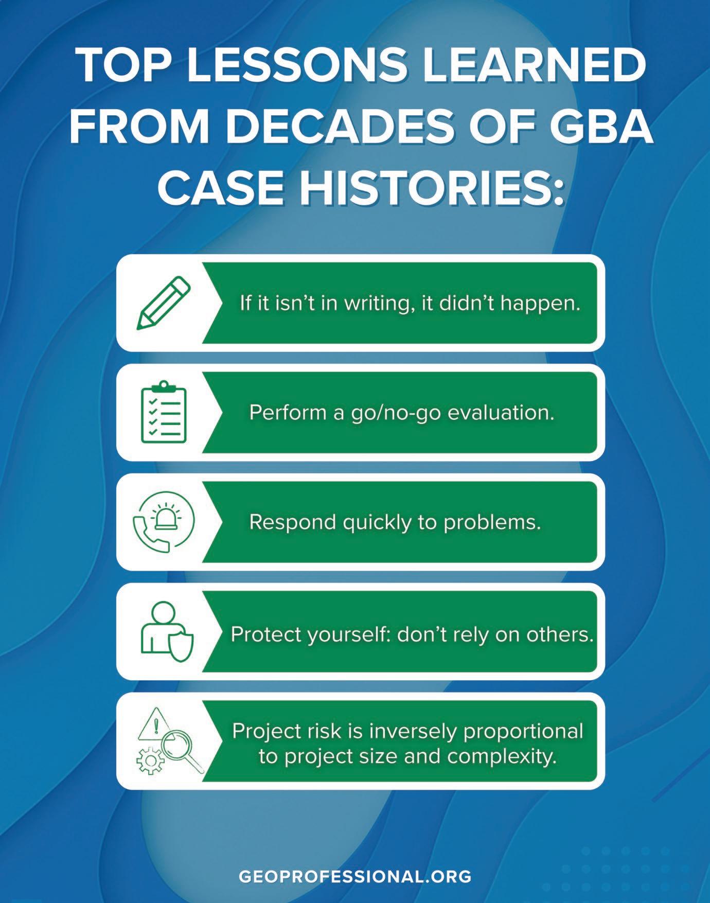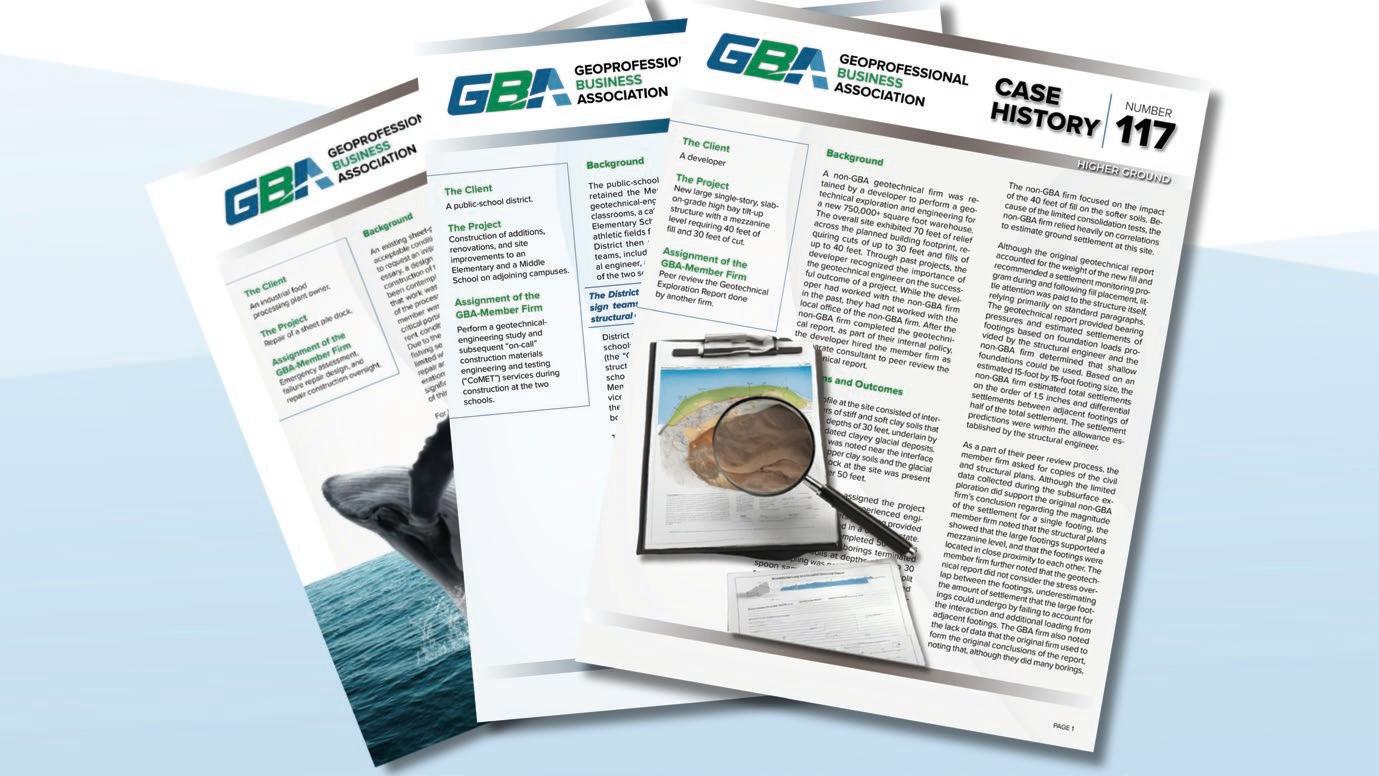 GBA has mastered the art of learning from challenges and problems experienced by other GBA member firms. For decades, GBA has been facilitating this learning by publishing case histories. Each case history summarizes the business operations or project work that had problems with technical analyses, project management, client relations, contracts, or business aspects. Many are based on project work by environmental professionals, geotechnical engineers, construction observation and materials testing providers (CoMET), and many other geoprofessionals, including office work and field work. Other case histories focus on concerns with human resources, legal affairs, business management, contracts, client relations, and communications. Litigation resulting from these mistakes is discussed in many of the case histories. Some deal with the fact that we are sometimes blamed for problems that are not of our making; legal claims against our firms may be based more on money than on truth, accuracy, or fairness.