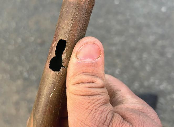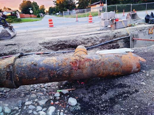 addressing a couple of the issues in the plant to get it back on-line producing water. We next directed our attention to locating the cause of all of the water loss. After several hours listening to hydrants in the distribution system with my LD-18 acoustical device, I located one hydrant that was screaming in my headset. We then set up a deployment of Z-corr correlators in the area of the hydrant. The results pointed us to the exact spot of the leak and it was marked. The very next morning the marked area was excavated and the leak was exposed and repaired. This leak was a main-line leak in 6" ductile iron pipe under 60 psi pressure. The leak ended up being calculated at between 150,000 to 200,000 gallons per day. The chemical cost savings estimated by the city administration was around $50,000 per year, not including freight costs. Not to mention the stress this leak created for the operator and the village leaders.