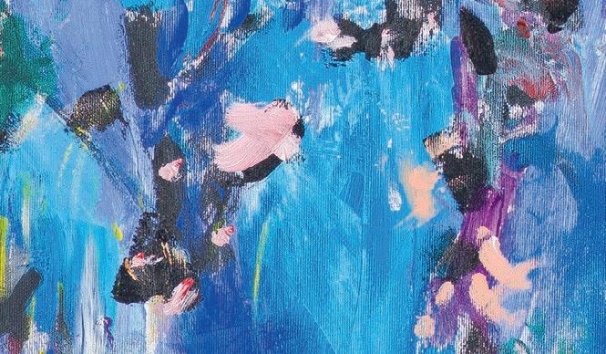 Well come on, let’s take another look! The man, my husband and father of my unborn child, puts his arm around me as I hold my belly, and we walk over to the bedroom, stopping to look at a blue painting. Stand right there, let me take a photo, he says, and I stop beside the painting, look into the camera, turn my head slightly to the left and smile. Did I paint that? My paintings used to be all dark, figurative, unsmiling women wearing heavy makeup, lonely girls staring far into space, hints of Ernst Ludwig Kirchner, dreary color palette. Is my hair okay? It’s fine. Do I need to touch it up? No really, you’re great, it’s spontaneous. What do I do with my hands? Cross your arms. Isn’t that kind of aloof? Then hold your belly. But isn’t that too pregnant? Well, but you are pregnant, aren’t you? Yeah, but I don’t have to spell it out for a painting like that. I won’t show your hands then, okay?